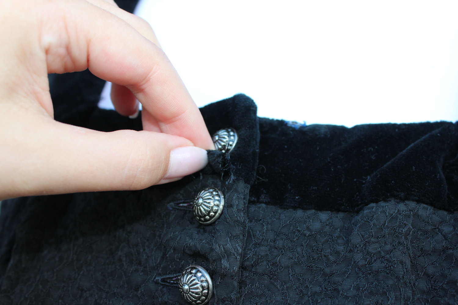 *) Geschlossen wird es vorne mit einer Knopfleiste aus silbernen Knöpfen.