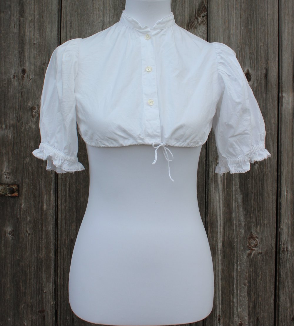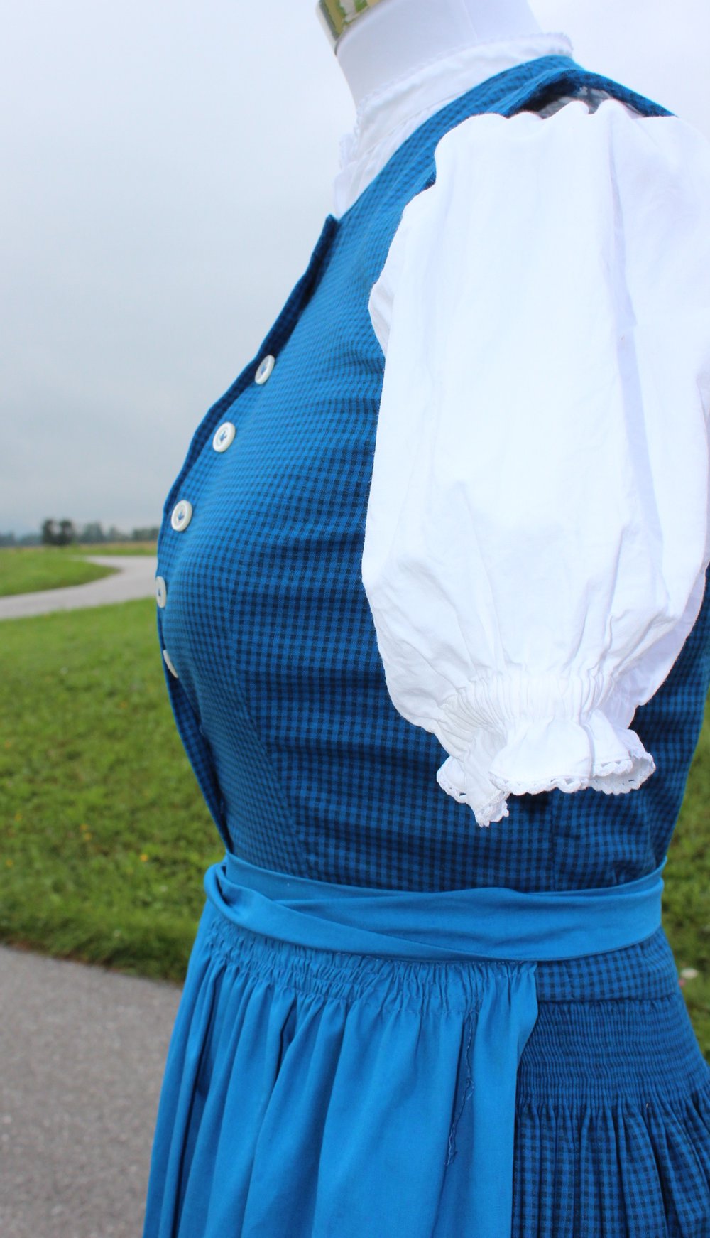 *) Zum Dirndl erhältst du eine weiße Bluse in Größe 36 von „Original Lanz Salzburg“ (mit Stehkragen, kurzen gepufften Ärmeln, einer Knopfleiste vorne, unter’m Busen einem Band – keinem Gummi, die Ärmel sind unten mit einem Gummiband gerafft, am Ausschnitt u. dem Ärmeln ist eine dünne Borte),