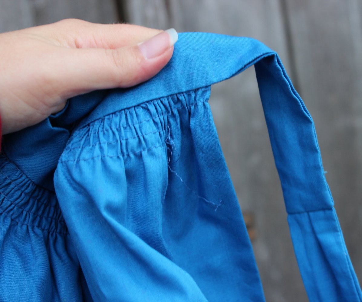 *) und eine unifarben, strahlend hellblaue Schürze (Baumwolle, wirkt selbstgenäht).