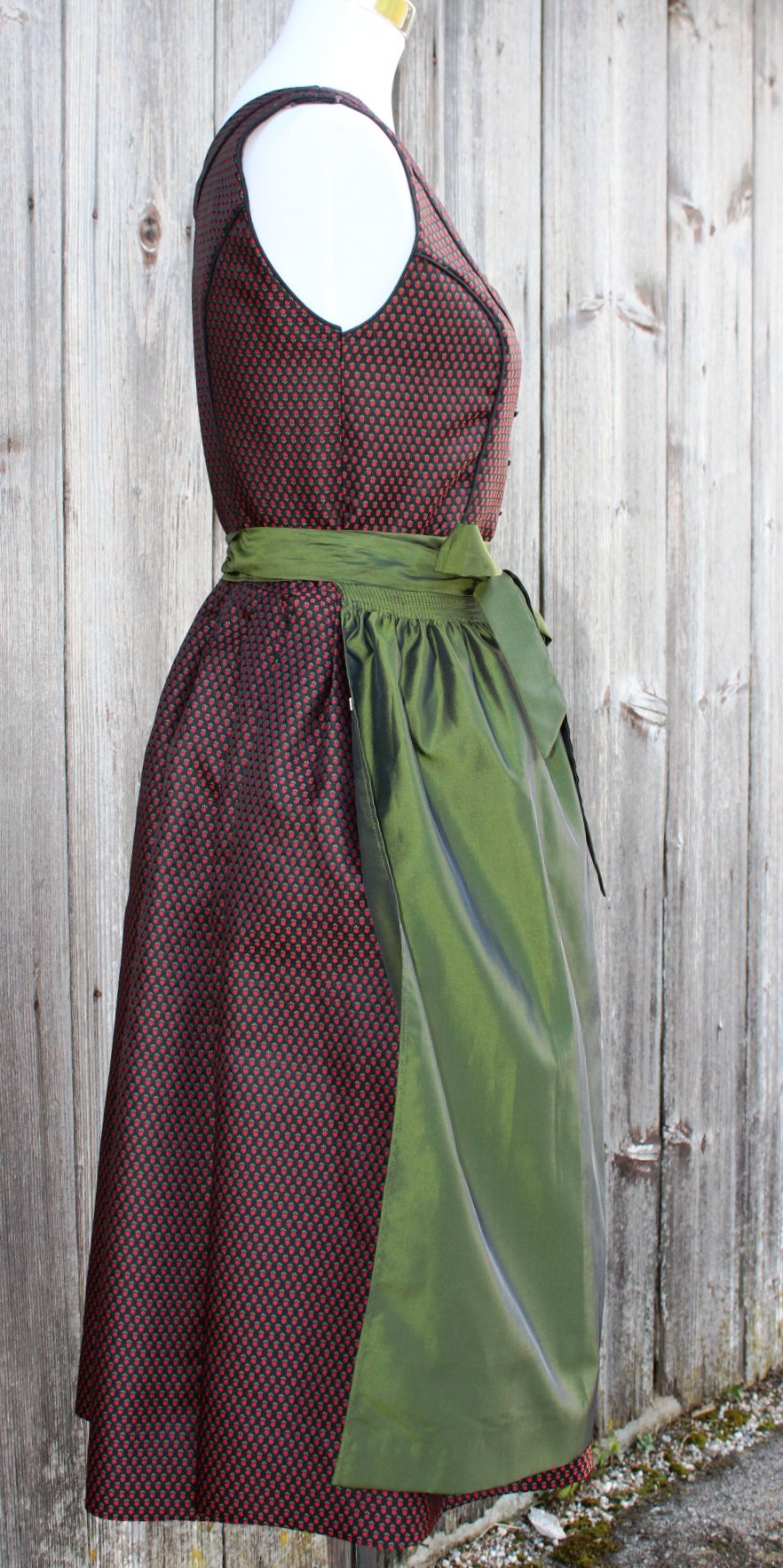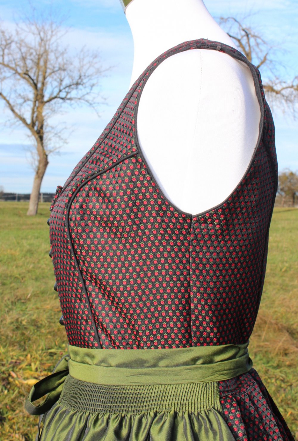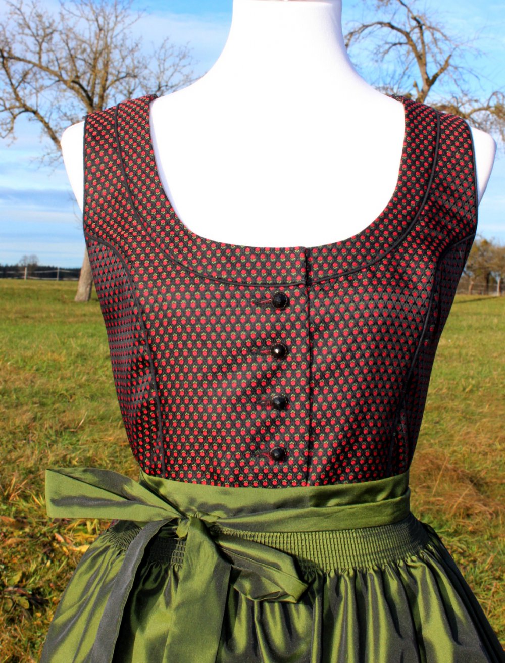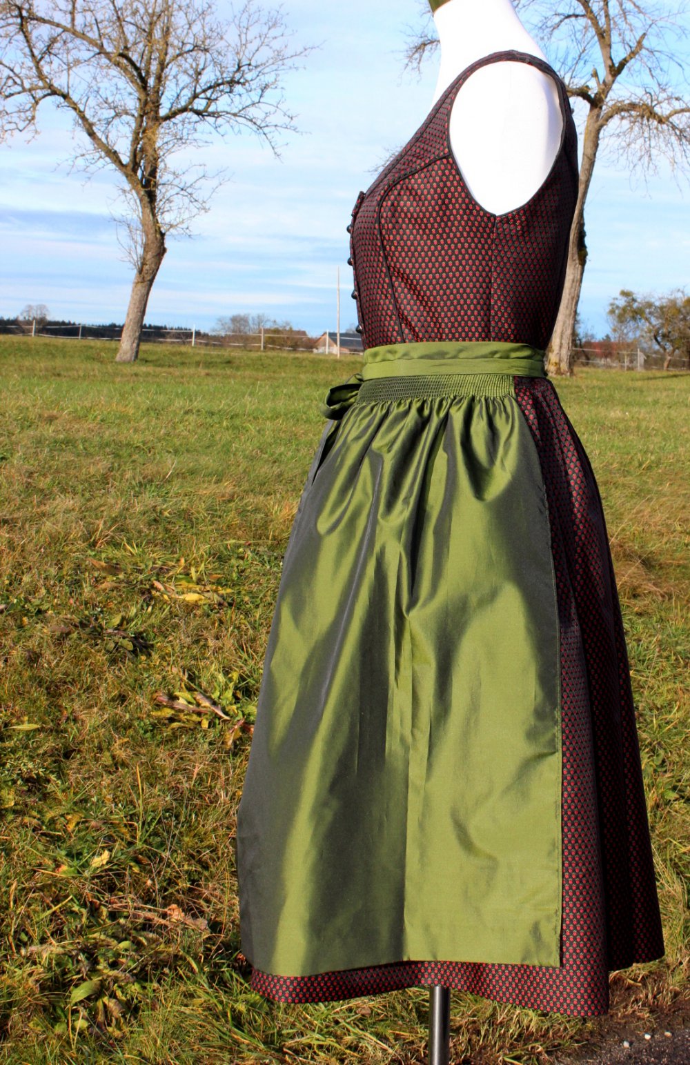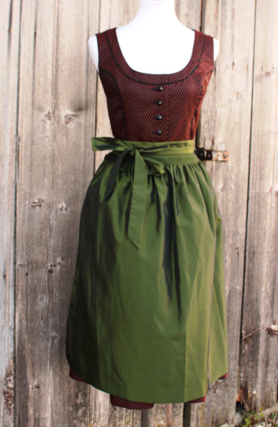 *) Zum Dirndlkleid gibt’s eine glänzende, unifarben olivgrüne Schürze