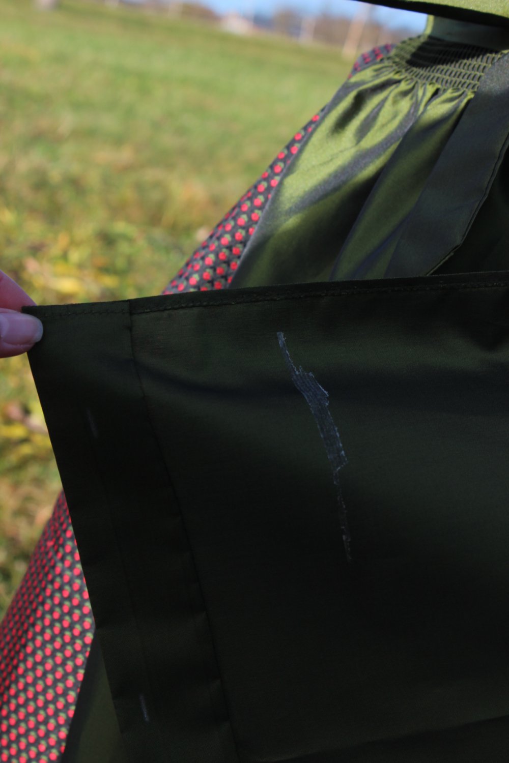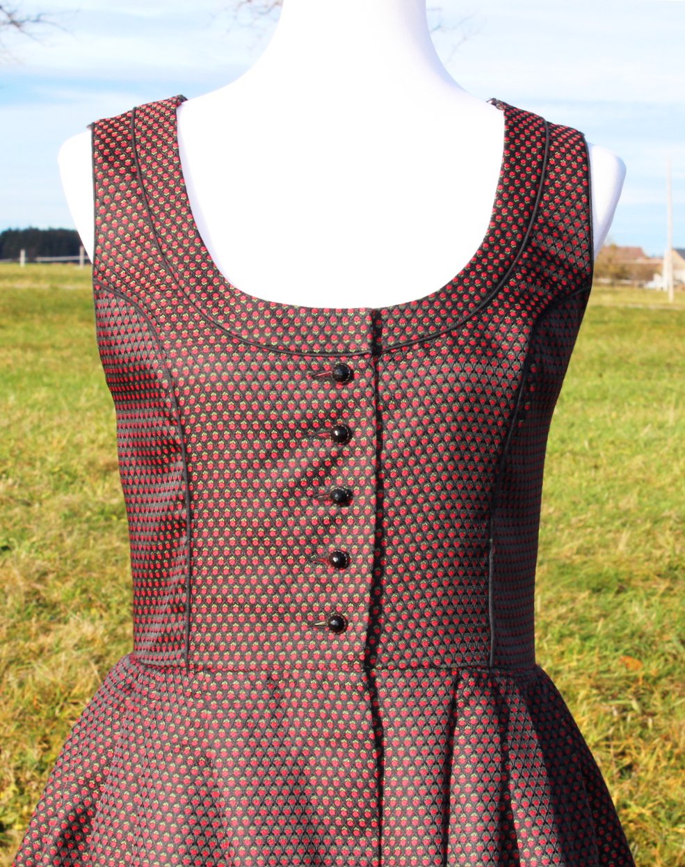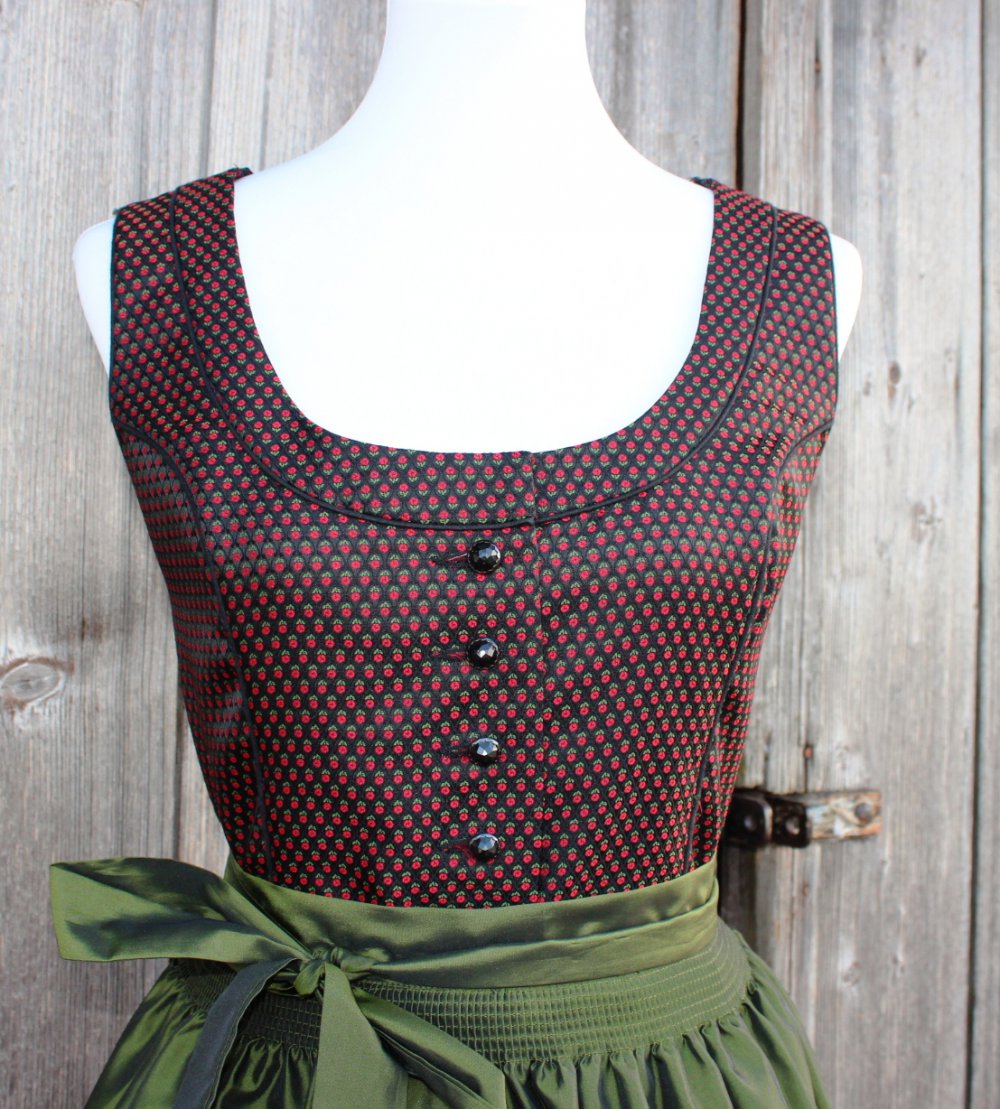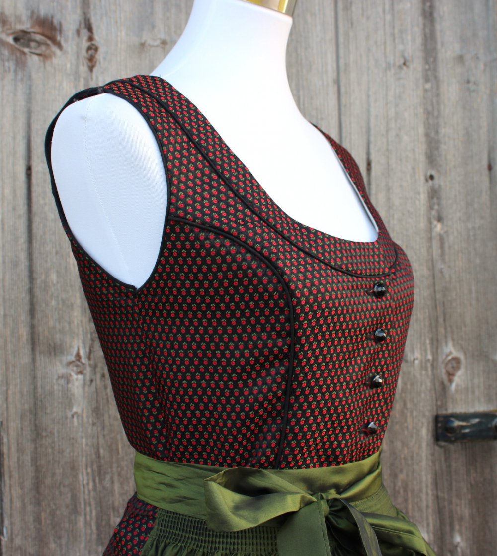 *) Der sehr hübsch glänzende Stoff erinnert mich eher an Festtagstrachten, denn an Dirndlkleider für den Alltag.
