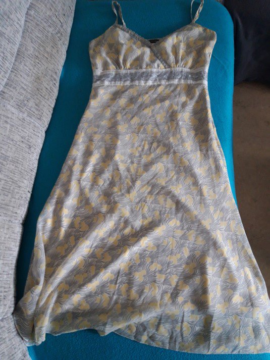 Schönes luftiges Sommerkleid trotz Unterrock! Geht bis über die Knie bei einer Größe von 1.80. Trägergröße individuell einstellbar. Schöne Spitzen-Applikationen an der Taille und dem Ausschnitt.