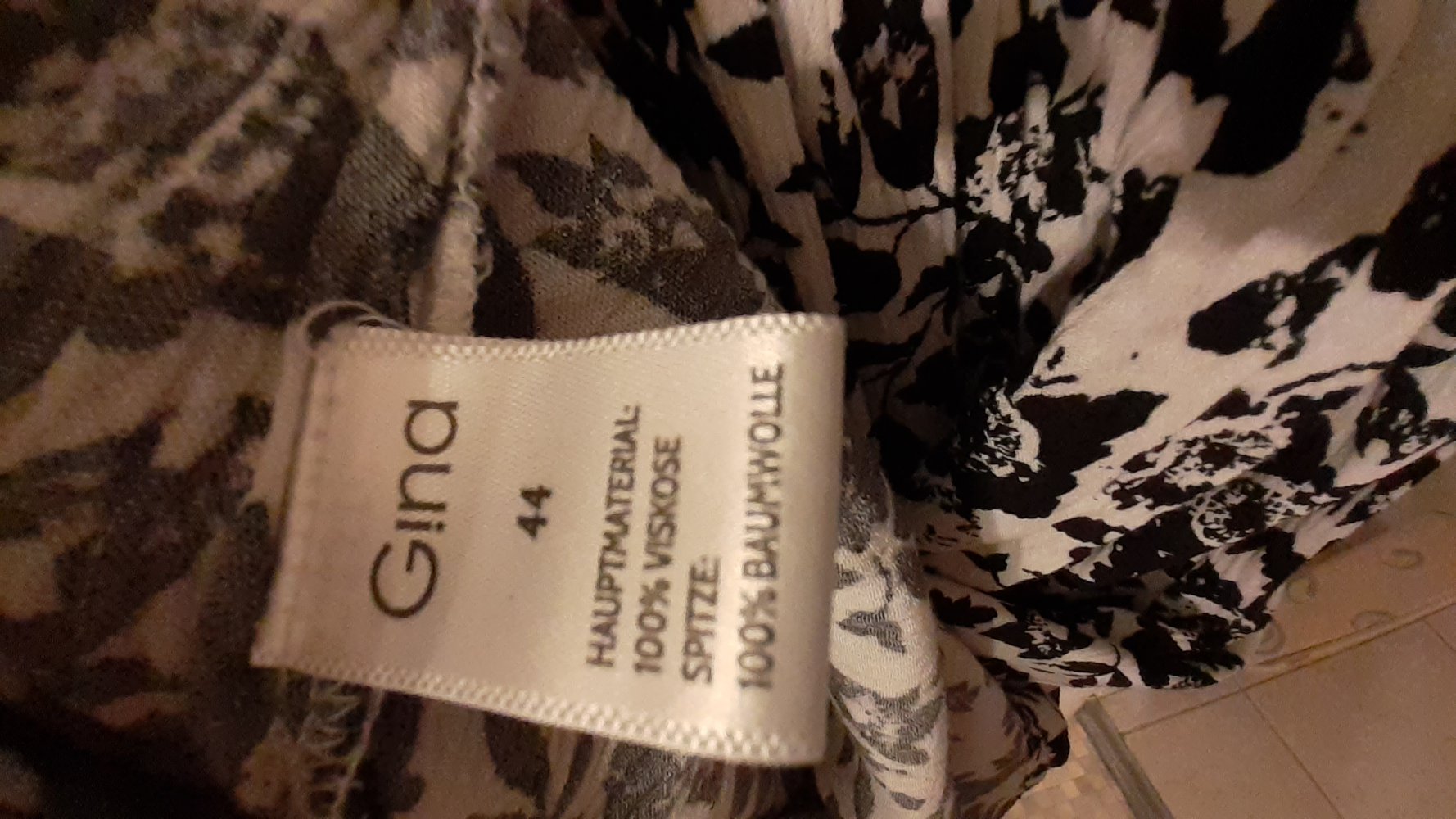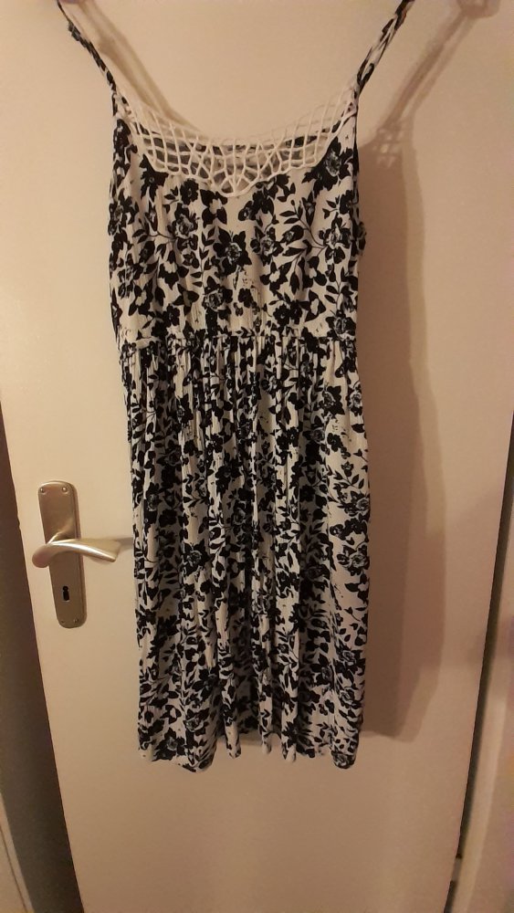 Sommerkleid mit Spaghettiträger schwarz weiß von Gina. Maße: Gesamtlänge ab Schulter 99 cm, Schulter bis Achsel = 29 cm , Achsel bis unten = 70 cm, von A nach A = 47