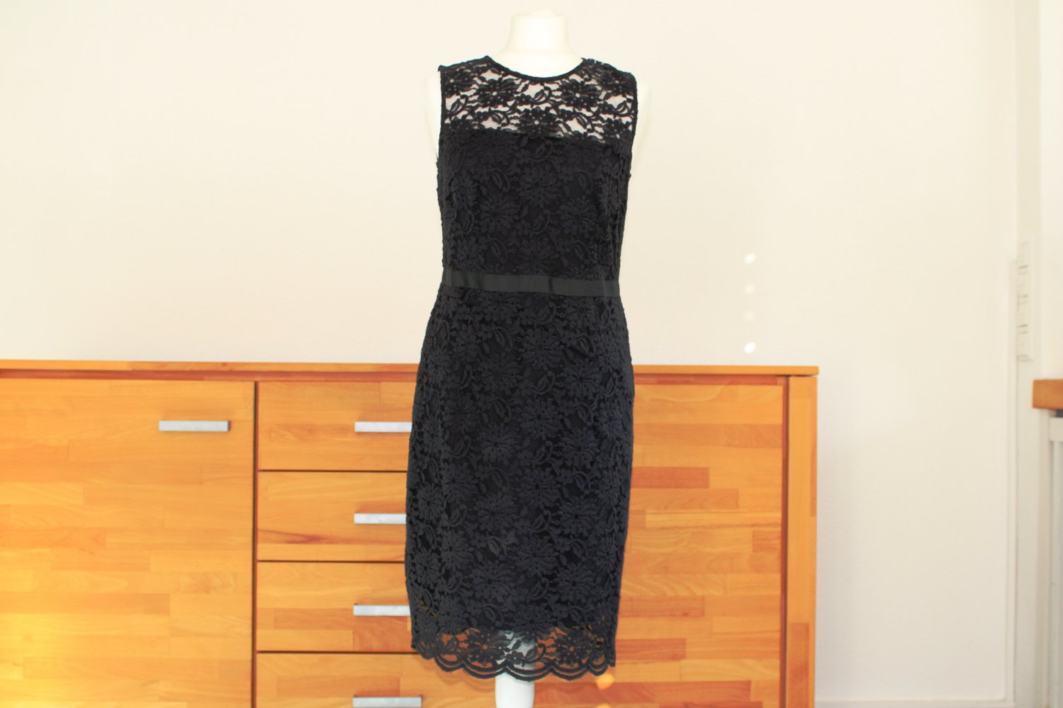 Schwarzes Spitzenkleid mit Rundhalsausschnitt in Größe 38 von Esprit. Rundum mit schwarzer Spitze verziert, betont durch eine Taillierung. Am Rücken ist oben ein kleiner Cutout sowie ein Knopf im Nacken zum Schließen.