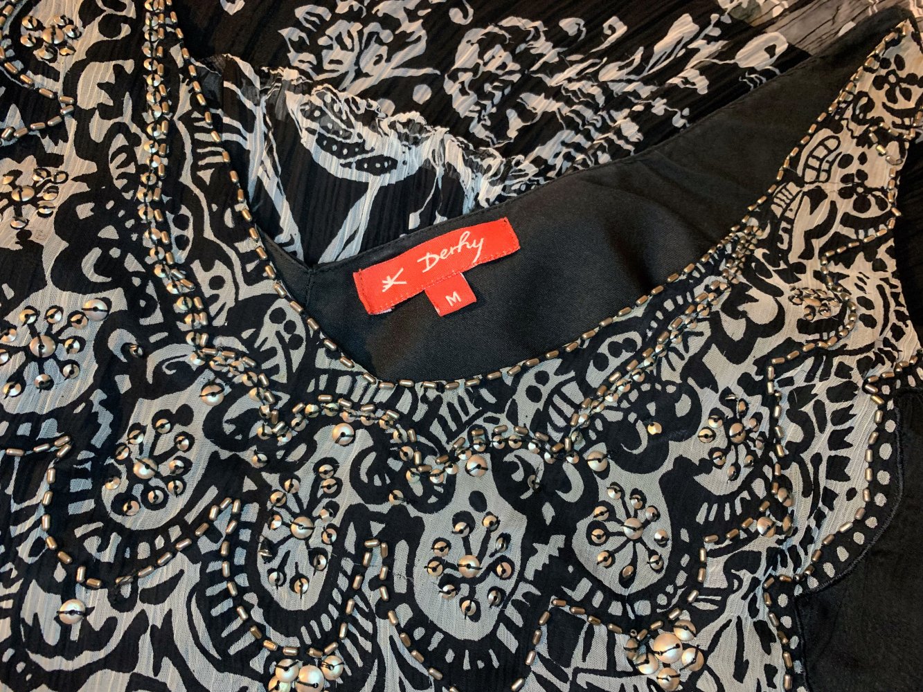 Elegantes, luftiges Sommerkleid aus der Derhy-Kollektion in fließender A-Linien-Form. Mit feinen Pailletten und Metallplättchen verziert, wirkt es modern und edel zugleich. Der transparente Crashstoff fällt sehr fein und leicht, das Kleid ist komplett gefüttert und hat einen seitlichen Reißverschluss.