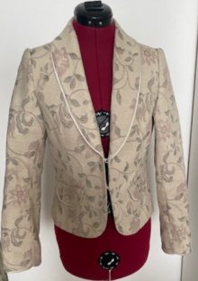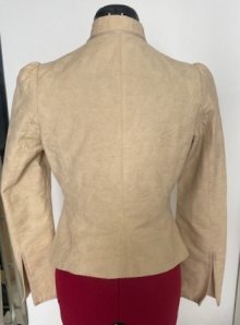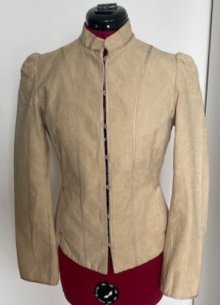 Ein Tageskleid mit ausgefallen Gagets, wie Lederapplikation und assymetrisch geschnittener Ausschnitt. Das Kleid ist (je nach Körpergröße) in Wadenlänge und hat seitlich einen Schlitz
