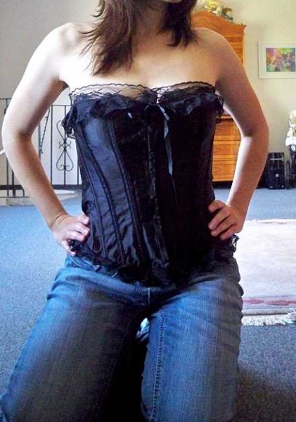 Raffinierte Corsage in klassischem Schwarz, mit Rüschenbesatz und süßen Satin-Schleifchen. Rückenpartie ist zum Schnüren, die Vorderseite kann mit Häkchen verschlossen werden- es gibt 2 Reihen, je nach Bedarf.