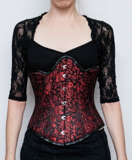 Sehr elegantes und extravagantes Unterbrustkorsett, sehr festes Material, dass sich gut schnüren lässt. Obermaterial ist eleganter, schwarz-roter Brokatstoff, innen stabile Baumwolle mit Korsettband. Es macht ein sehr schönes Dekolleté und lässt sich mit verschiedenen Oberteilen und Blusen kombinieren. Leider fülle ich es oben nicht ganz aus, weshalb es nun eine neue Besitzin sucht.
