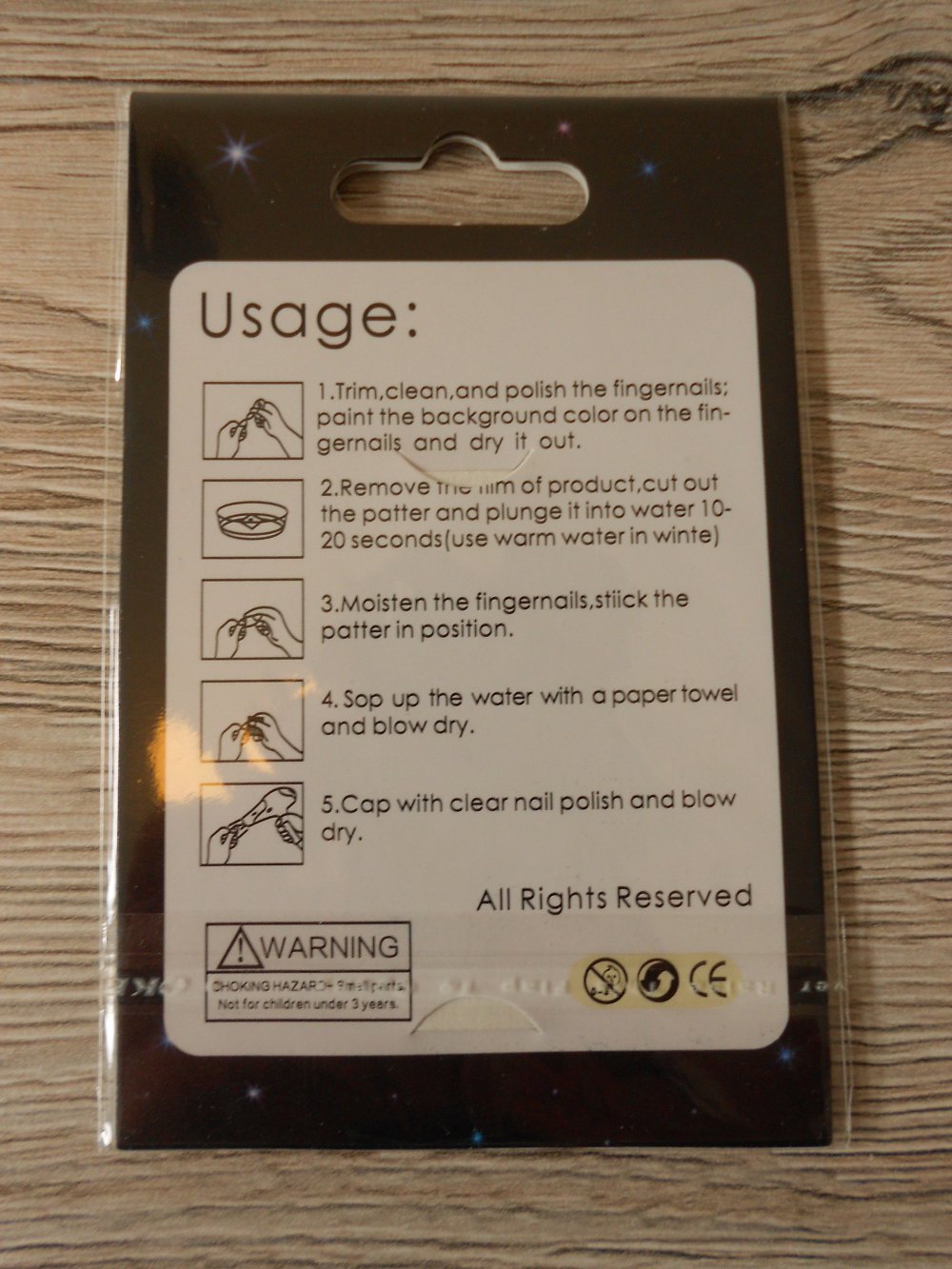 Diese werden wie in der Anleitung (zweites Bild) in Wasser gelegt und vom Trägerpapier gelöst. Anschließend können diese auf dem Nagel platziert werden. Sie sind sehr dünn und passen sich der Nagelform gut an. Sie sollten zur längeren Haltbarkeit aber mit Klarlack versiegelt werden.