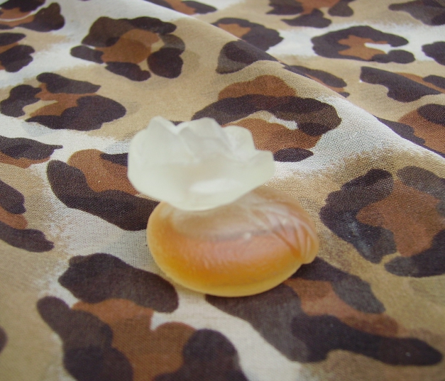 4 ml, fast voller Miniatur-Flakon im Blattdesign mit rauchglasigem Rosen-/Floraldesign-Verschluss.