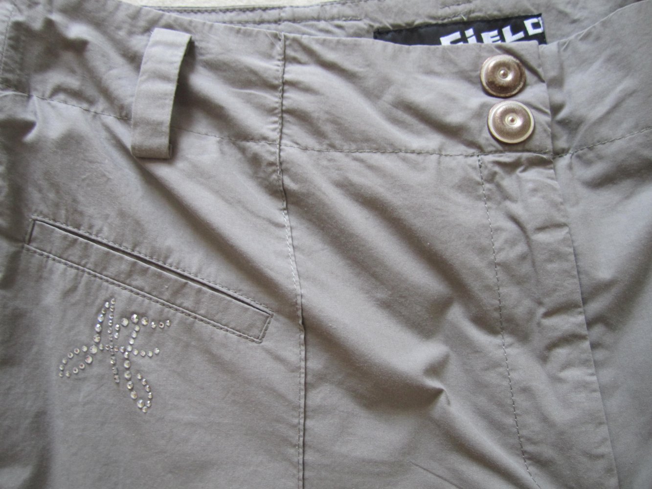 DIe 7/8-Hose ist einfarbig taupe, schlank geschnitten und mit glitzerndem AF auf der rechten Tasche. Schönes Logo rückseitig. Einfache Bundweite 39 cm, Gesamtlänge 75 cm.