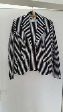 Sehr schicker Hosenanzug, schwarz/weiß gestreift (Streifen sind gleich stark) in Größe 38, der Blazer sowohl die Hose. Die Hose ist typisch Bootcut Schnitt, der Blazer ist schön tailliert. Habe den Anzug nicht einmal getragen, ist mir dann doch zu Business-schick. Ich schicke gern noch weitere Bilder auch Trage-Bilder falls gewünscht.