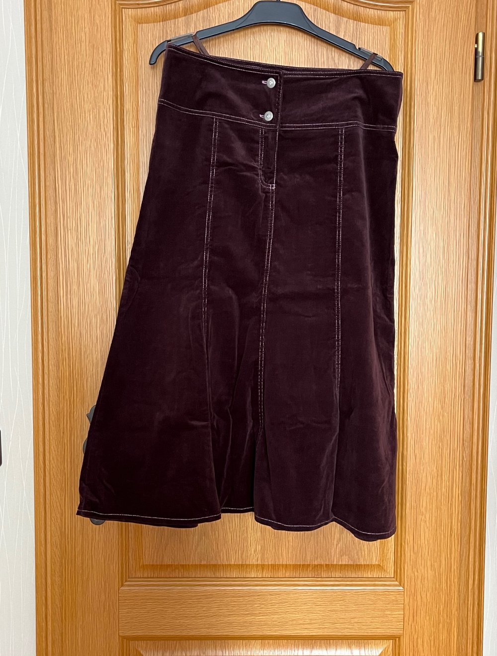 2) Rock - Reißverschluss vorne und 2 Metallknöpfen, mit Nähten verziert.