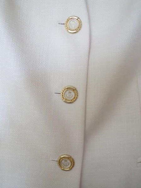 1) BLAZER: ohne Kragen, durchgehend Knopfleiste mit goldenen Knöpfen. Leicht tailliert mit Wiener Nähte, mit Schulterpolstern und 2 Einschubtaschen.