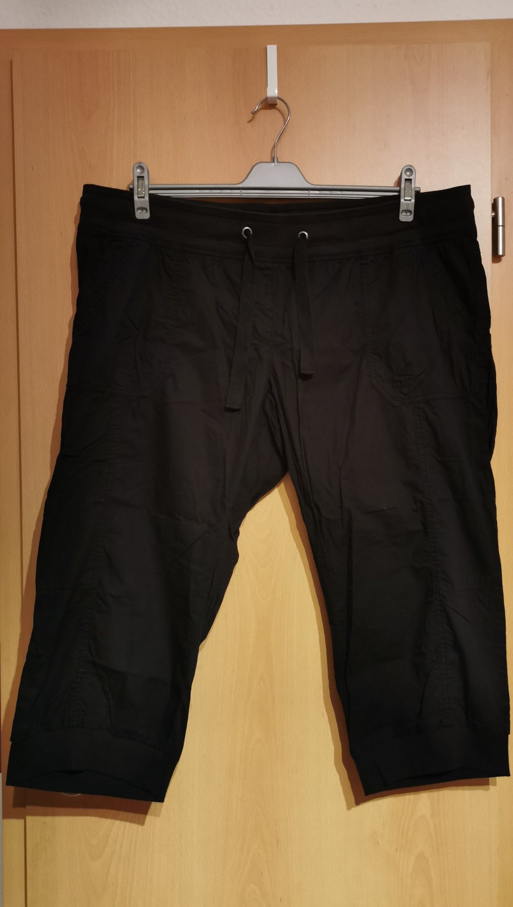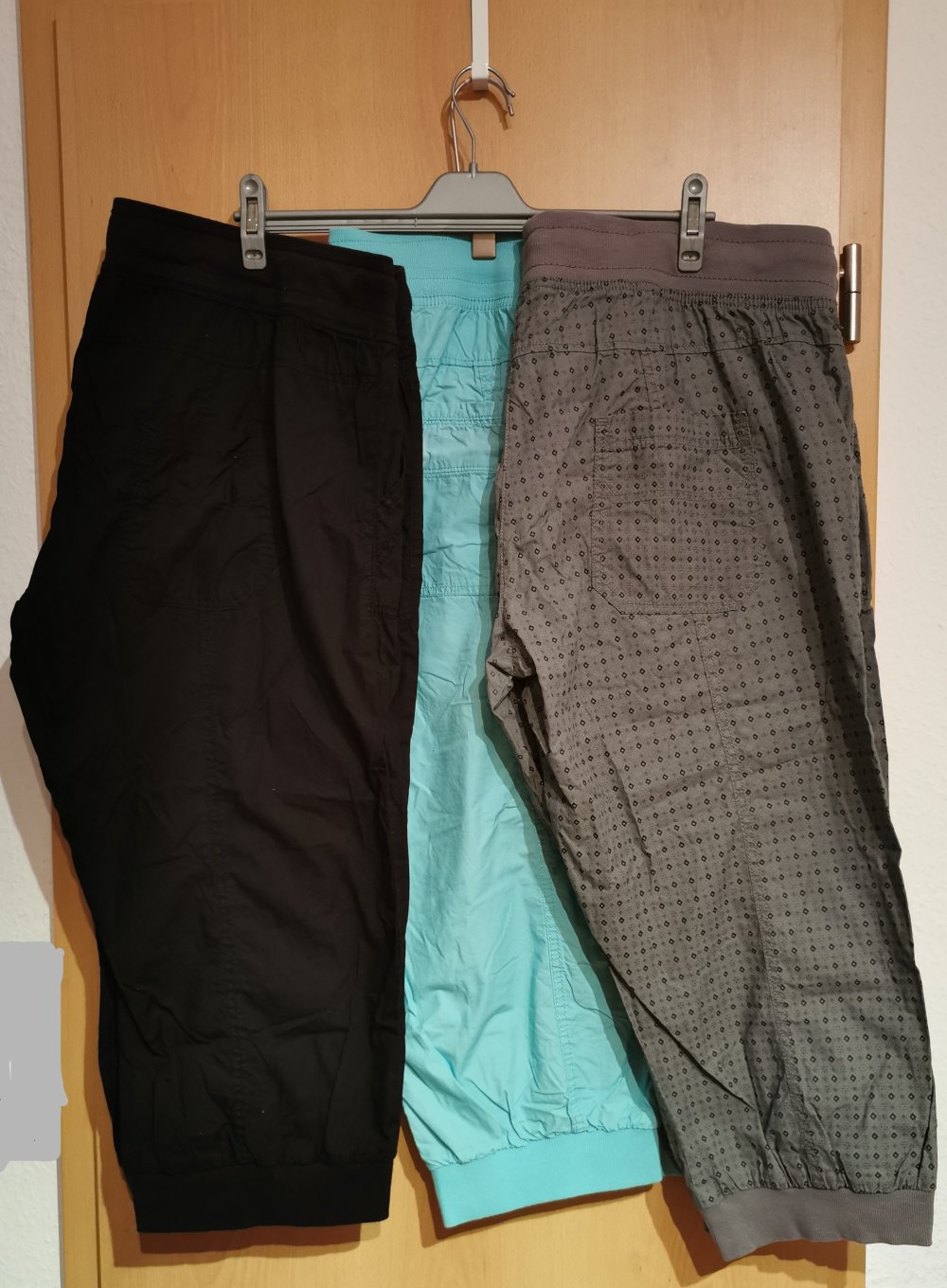 Ich biete dieses 3er Set Hosen an. Das Set besteht aus einer grauen Hose mit schwarzem Muster, aus einer Hose die türkis ist und aus einer schwarzen Hose. Die Hosen haben die Größe 50 und sind von Gina Benotti. Sie haben ein Gummibund mit Kordelzug, zwei Eingriffs- und zwei Gesäßtaschen und auch einen Gummibund am Beinende. Die schwarze Hose ist ungetragen und wurde nur gewaschen. Die graue Hose wurde getragen, ist aber in einem sehr gutem Zustand. Die türkisene Hose wurde auch getragen, hat an der einen Eingriffstasche eine Verfärbung sowie an der einen Gesäßtasche eine weiße Verfärbung. Ansonsten ist sie auch in einem sehr gutem Zustand.