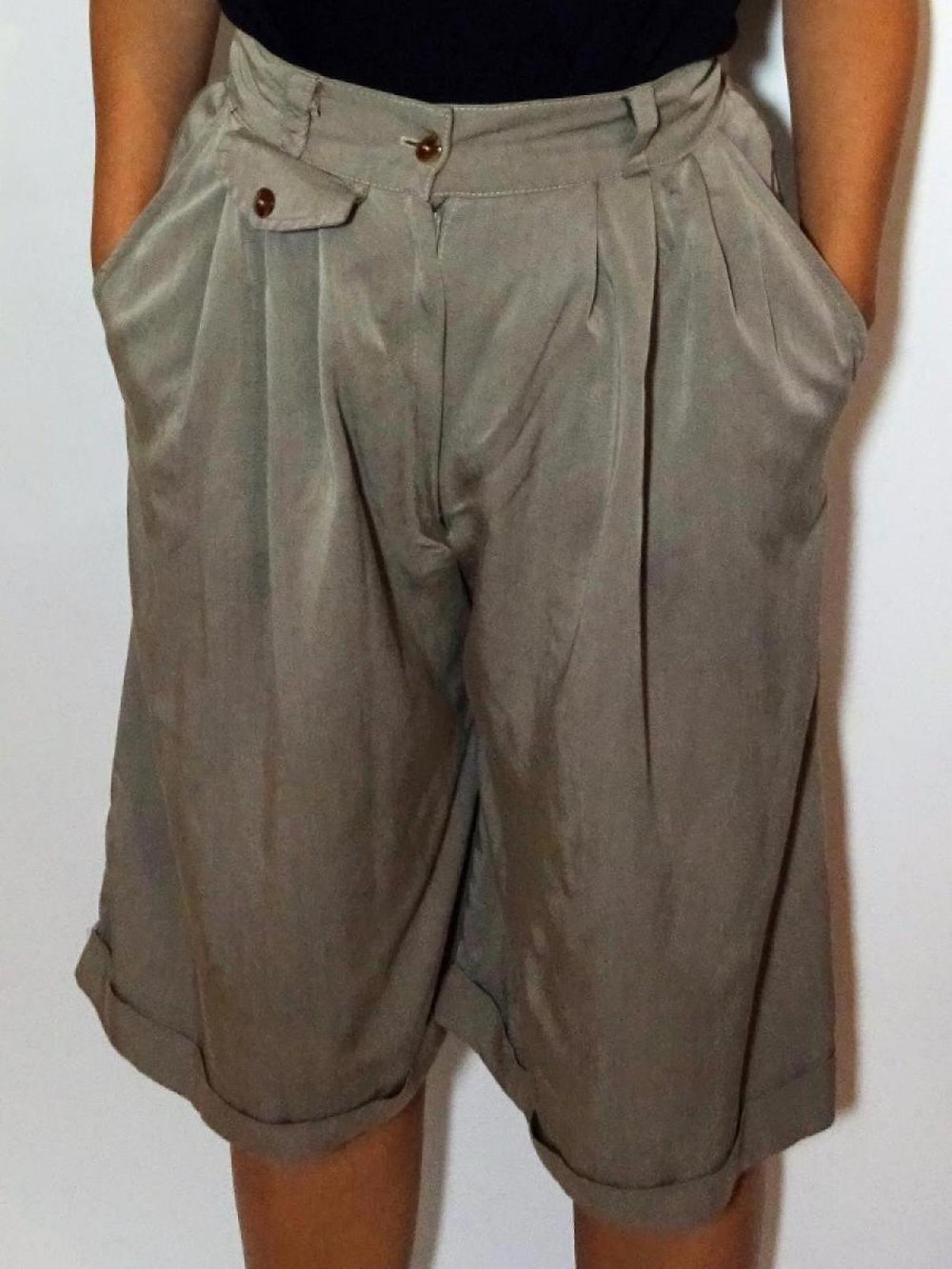 Hübsche, leicht glänzende, weite Shorts aus den 80er Jahren. Die Beine sind sehr locker und luftig geschnitten. Die Hose hat zwei Taschen und eine Ziertasche auf der Vorderseite.