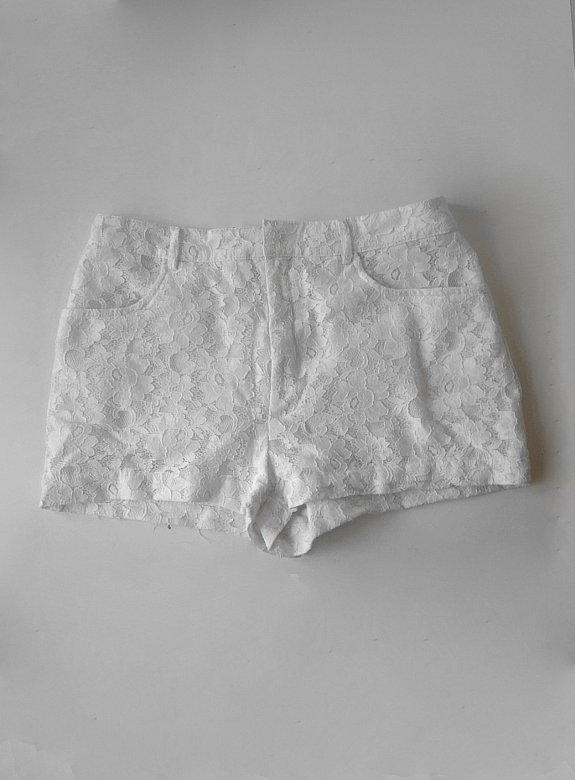 Shorts aus weißer Blumen Spitze, vorn ist eine kleine Verfärbung - sieht man aber kaum (siehe Bild)