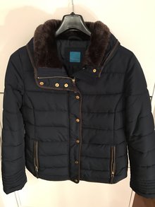 Wurde einmal getragen und ist somit neuwertig. Hat keine Mängel. Das Fell am Kragen ist kuschelig weich. Die Farbe ist blau mit braun. Der Neupreis lag bei 59€.
