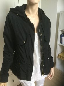 Neue schwarze Jacke mit abnehmbarer Kapuze,Gr M,mit Etikett,aus 2 verschiedenen Stoffen, mit goldenen Reißverschluss und goldenen Knöpfen,sehr hochwertig,Material aus Baumwolle( Ärmel und Kapuze), Futter in hell Beige mit Pünktchen.NP 69,99,Maße:Brustbreite 47 cm ,Länge 68,5 cm, Ärmellänge unter d.Arm 50cm.
