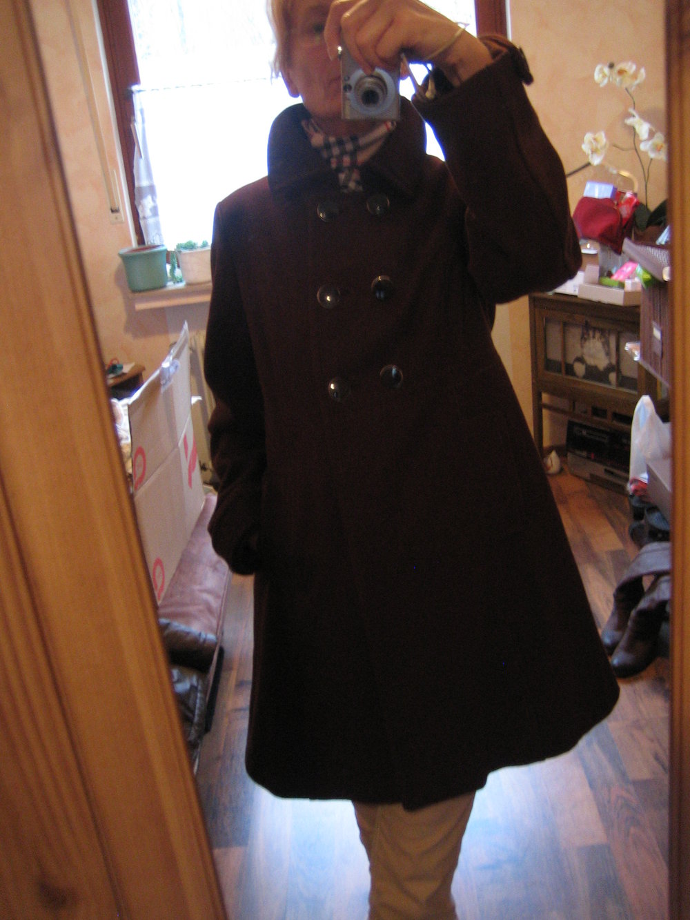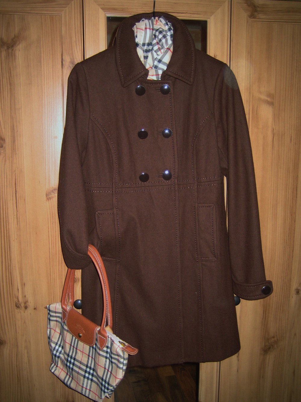 Dunkelbrauner Mantel von H&M , leichte A-Linie duch Kellerfalte im Rücken. Mit schön tiefen Eingrifftaschen und tollen großen Knöpfen.