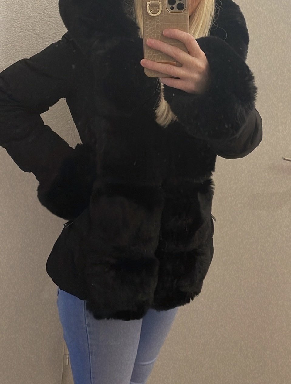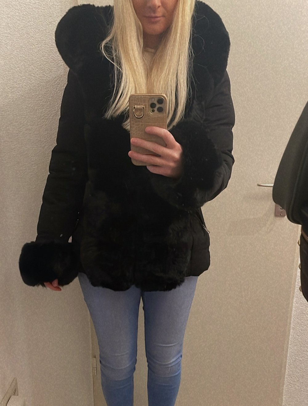 Schwarzer Parker mit Lederelementen und Fellkaputze viele Taschen