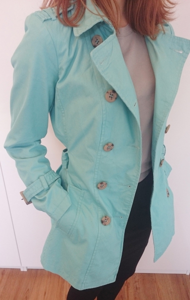 Es handelt sich hier um einen kurzen Trenchcoat, der so gut wie neu ist. Durch den abnehmbaren Bindegürtel kann man ihn der eigenen Figur auf Höhe der Taille perfekt anpassen, die Knöpfe weisen eine sehr hochwertige Hornoptik auf. Zusätzlich besitzt er auch einen Hakenverschluss am Kragen und Schulterriegel.