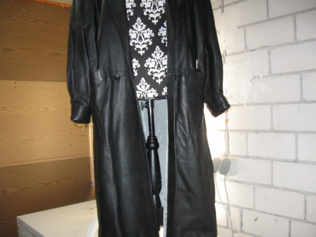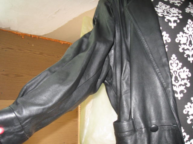 Dieser Mantel hat an den Schultern eine schmale Passe. Von da ab fällt er in kleinen Falten herab. Ab der Taille ist er dann schlank geschnitten. Er hat einen sehr schönen Reverkragen der bis zur Taille reicht. Da wird der Ledermantel als Doppelreiher mit 2 Lederknöpfe geschlossen. Parallel zu den Knöpfen sind die eingearbeiteten Taschen.