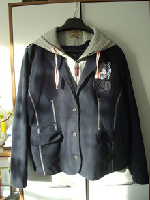 Damenjacke. Sweatblazer mit abnehmbarer Kapuze ( durch Reißverschluss verbunden) von der Marke Soccx. Zwei aufgesetzte Taschen vorn, Stickereien auf Brust- und oberer Rückenpartie. An den Armgelenken noch Verstärkung durch Aufnäher. maschinenwaschbar, dunkelblau.