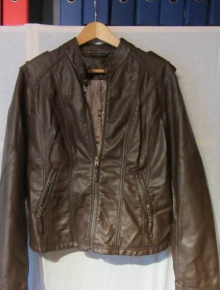 Toll geschnittene Jacke aus Lederimitat in cognac-braun im Bikerstyle in Größe 42. Reißverschluss vorn und an den Ärmeln, zwei Taschen, die ebenfalls per Reißverschluss geschlossen werden können. Riegel am Halsschnitt mit Druckknopf, sowie zwei Riegel auf den Schultern. Figubetont durch Raffung im Rücken. Schöner, farblich abgestimmter Futterstoff. Da das Schild innen im Rücken gekratzt hat, habe ich es leider herausgetrennt. Die Jacke wurde nur einmal getragen.