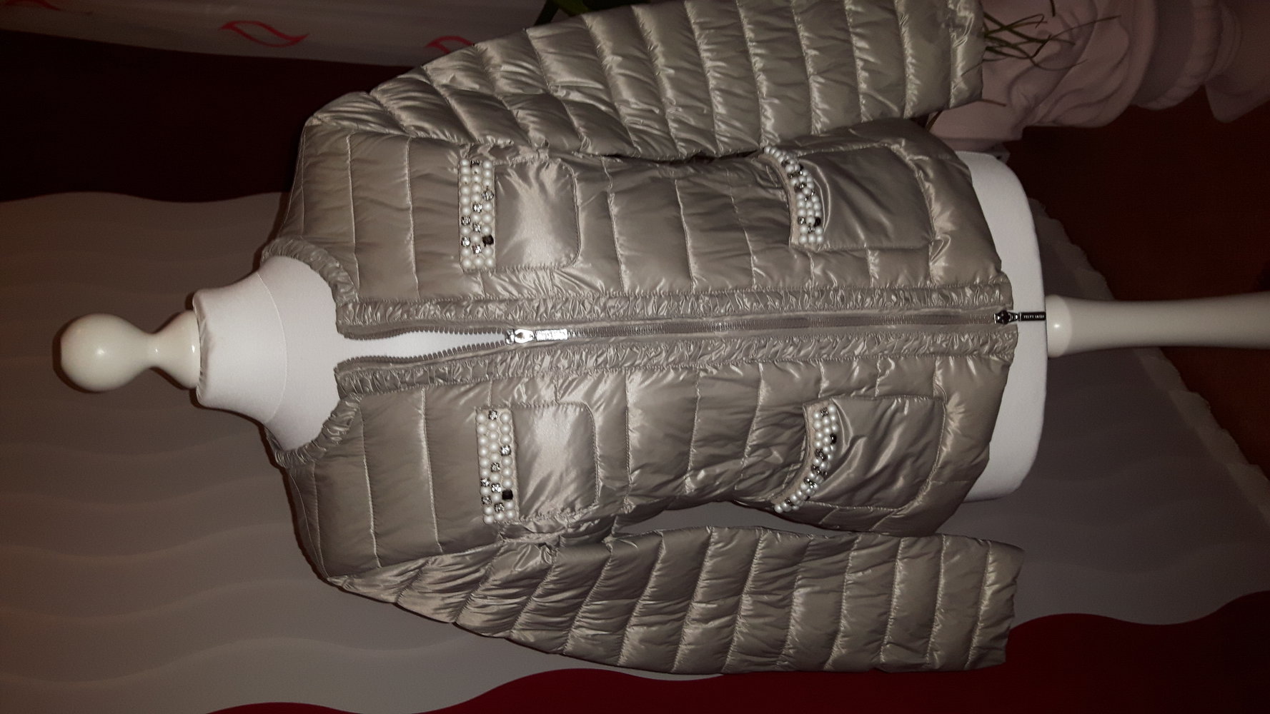 Sehr schöne, elegante, gesteppte, beige Kurzjacke mit aufwändiger Verzierung aus Perlenknöpfchen und Strasssteinchen an den Taschen. Die Jacke hat einen Zweiwegezipper sowie das Labelzeichen auf dem oberen Rückenteil. Egal was man dazu trägt, man sieht immer elegant oder festlich gekleidet aus.
