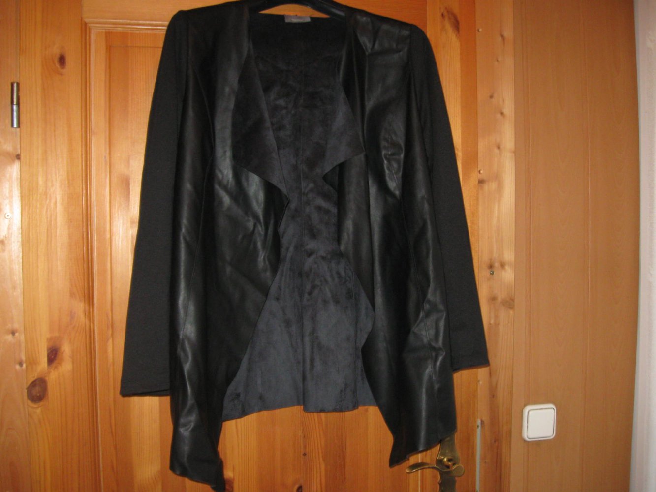 Biete diese Jacke. Sie besteht aus Kunstleder und besitzt Stoffärmel. Guter gebrauchter Zustand an den Ärmeln etwas Pilling ansonsten alles ganz, keine Flecken oder Löcher. Diese Jacke passt bei einer Gr. 42-46. Da diese Jacke keinen Verschluss besitzt, fällt sie vorne etwas zipfelig und kaschiert super. Hier einige Maßangaben:
