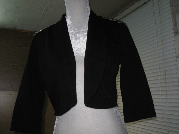 Super Jäckchen mit Perlen & Pailetten auf den Schultern. Leider fehlen zwei Perlen, auf der linken Schulter, es fällt aber nur beim genauen Hinsehen auf. Sie besitzt einen 3/4 Arm. Hier noch einige Maßangaben:
