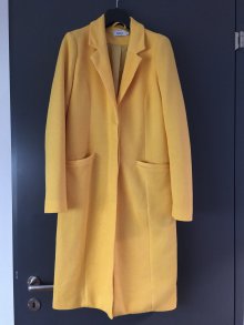 Dieser sonnig gelbe Mantel eignet sich besonders für Frühlings- oder etwas kühle Sommertage. Er ist knielang und lässt sich mit zwei Knöpfen vorne schliessen. Da ich ihn doch das ein oder andere Mal getragen habe, ist der Stoff ein klein wenig fusselig. Aber sonst ist der Mantel in sehr gutem Zustand.