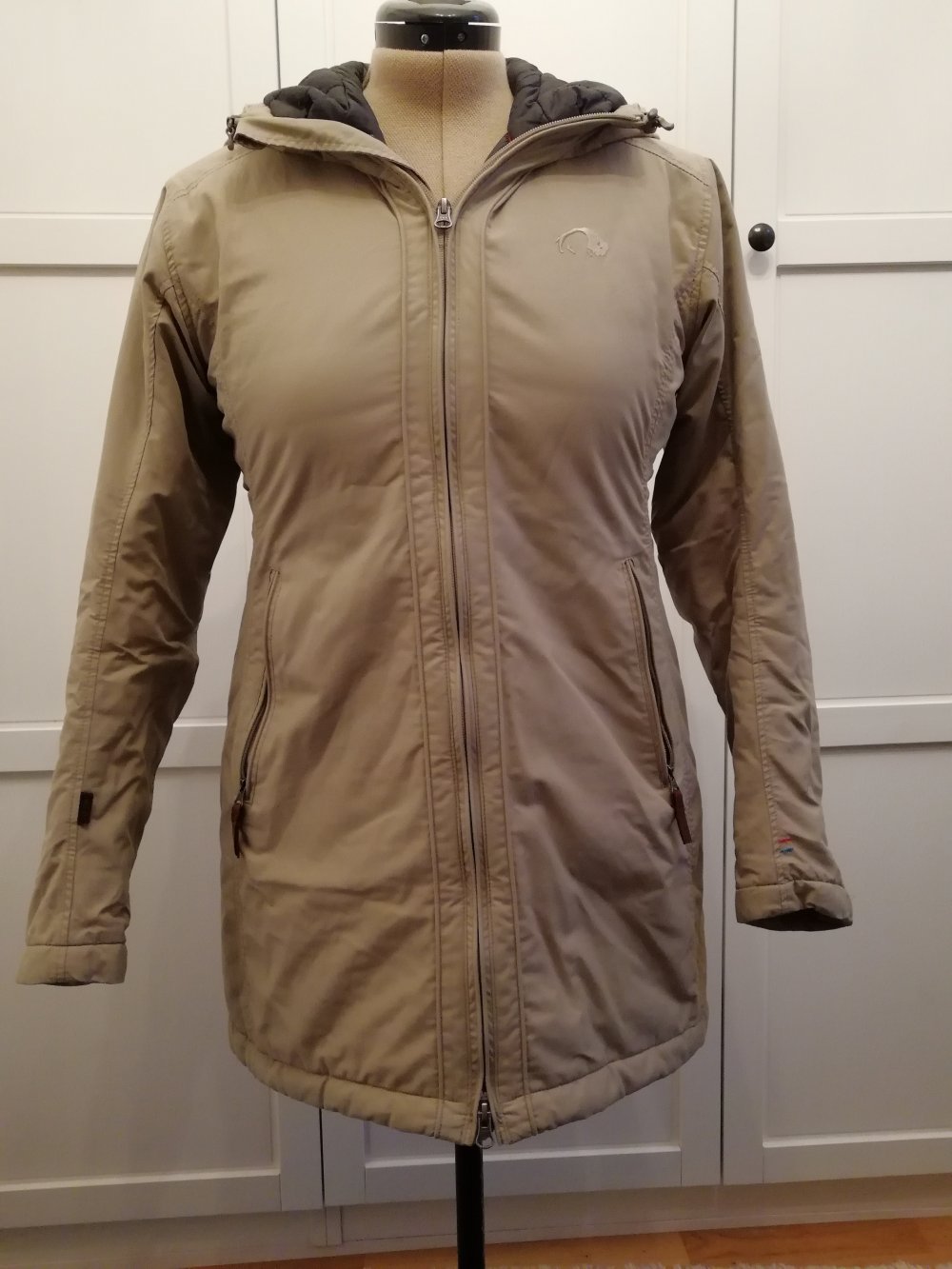 Beiger Wintermantel in Größe 38, Tatonka, selten getragen. Innen dunkel, mit Kapuze. Außen und innen Taschen (innen eine etwas kleinere), alle mit Reißverschluss.