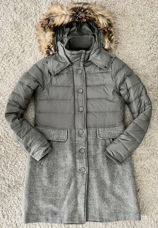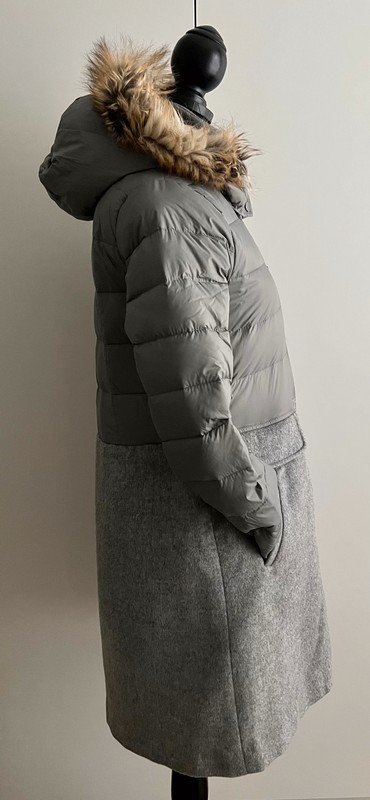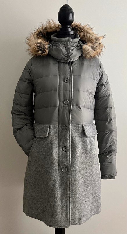 Schöner, ausgefallener Mantel mit Materialmix. Der Mantel ist wirklich ein echter Hingucker. Er hat viele liebevolle Details. Dazu zählen z.B die aufgesetzten Schulterriemen, die dekorative Knopfleiste und Taschen, die abnehmbare Kapuze mit Kunstfellbesatz. Der Oberrhein zeigt sich in einer Steppoptik, unten geht der Mantel dann in Wolle über. Er kann sowohl mittels eines Reißverschlusses, als auch mit der Knopfleiste geschlossen werden. Der Mantel ist so gut wie neu und wurde nur 1-2x getragen. Bei weiteren Fragen könnt ihr mir gerne, jederzeit eine Nachricht zukommen lassen. Genaue Maße können gerne, jederzeit angefragt werden.