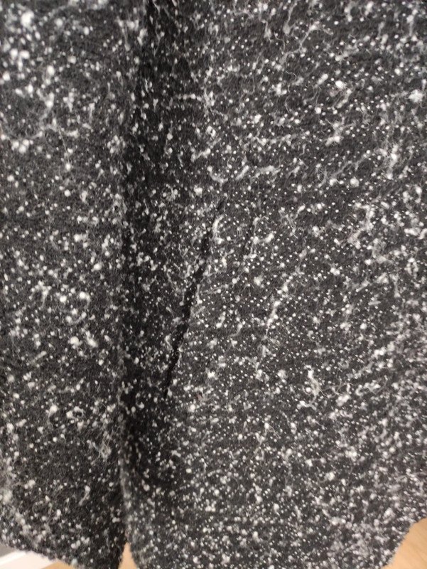 Mittellang, in leichter A-Linie, hat Taschen. Das ist kein Pilling, das Material ist so "wollig", mit Kapuze, kann mit zusätzlichen Knopf am Hals enger zugemacht werden, sodass kein Schal benötigt wird, schwarz meliert, dicker Wollmantel, Wintermantel
