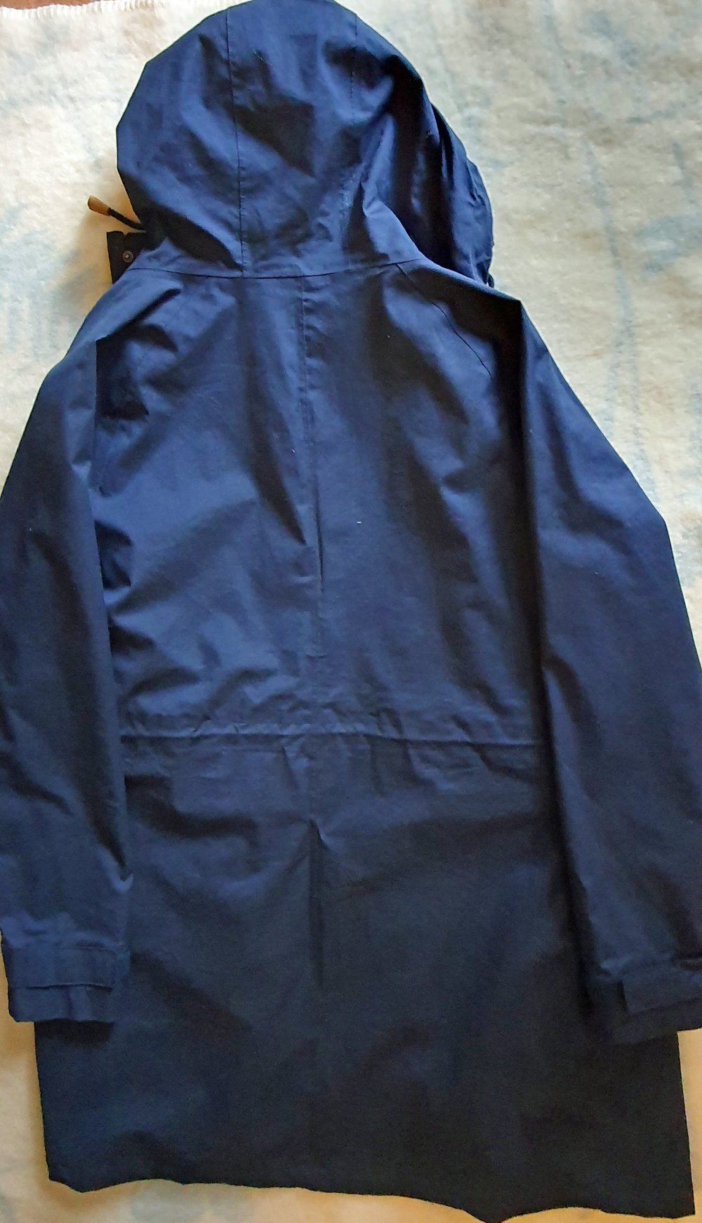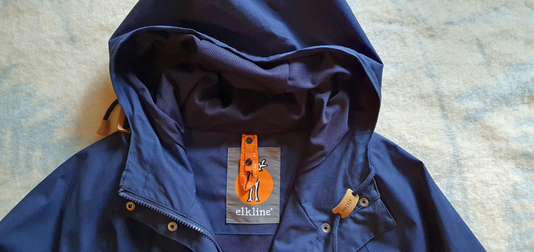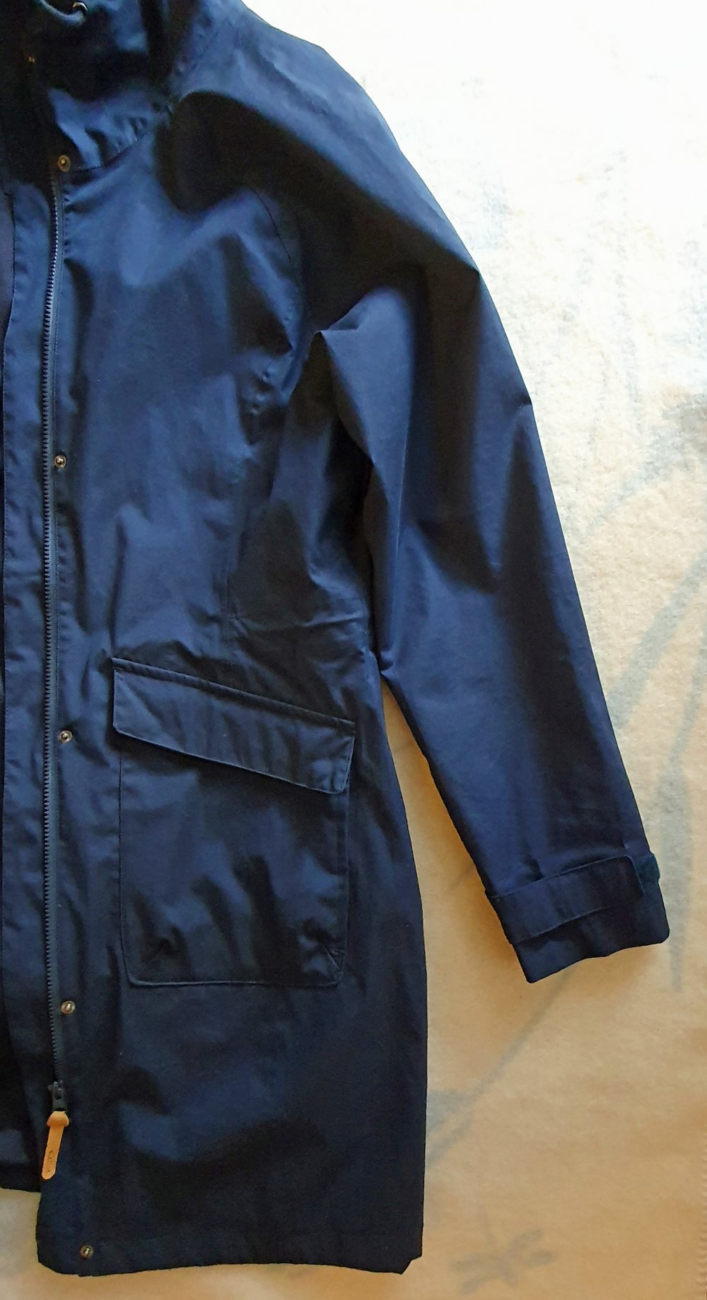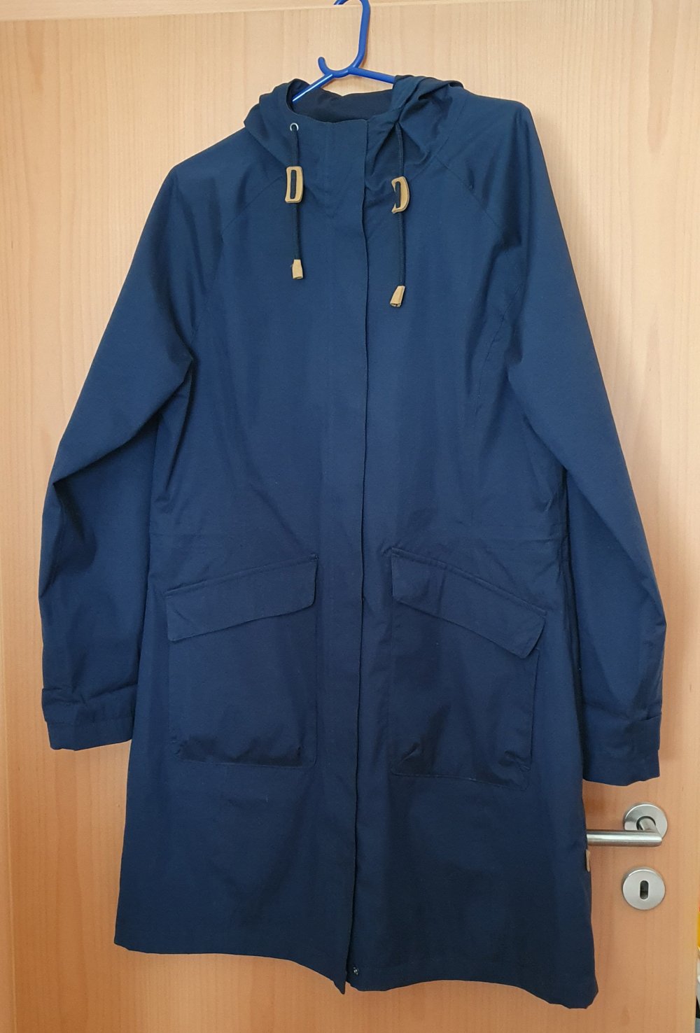 leichter Sommermantel in blau von elkline mit Kapuze; kaum getragen, deshalb hervorragender Zustand; innen Kordelzug, um die Weite an der Taille zu regulieren, 1 Innentasche, 2 Außentaschen mit Druckknöpfen, Ärmel mit Klettverschlüssen, an der Vorderseite des Mantels langer Reißverschluss und zusätzliche Leiste mit Druckknöpfen, Kapuze kann ebenfalls mit einem Kordelzug angepasst werden, Länge 101 cm ohne Kapuze, Länge 127 cm mit Kapuze, Breite unter den Ärmeln 58 cm, Ärmellänge innen 53 cm, Ärmellänge au0en 78 cm, Mantel ist gerade geschnitten.