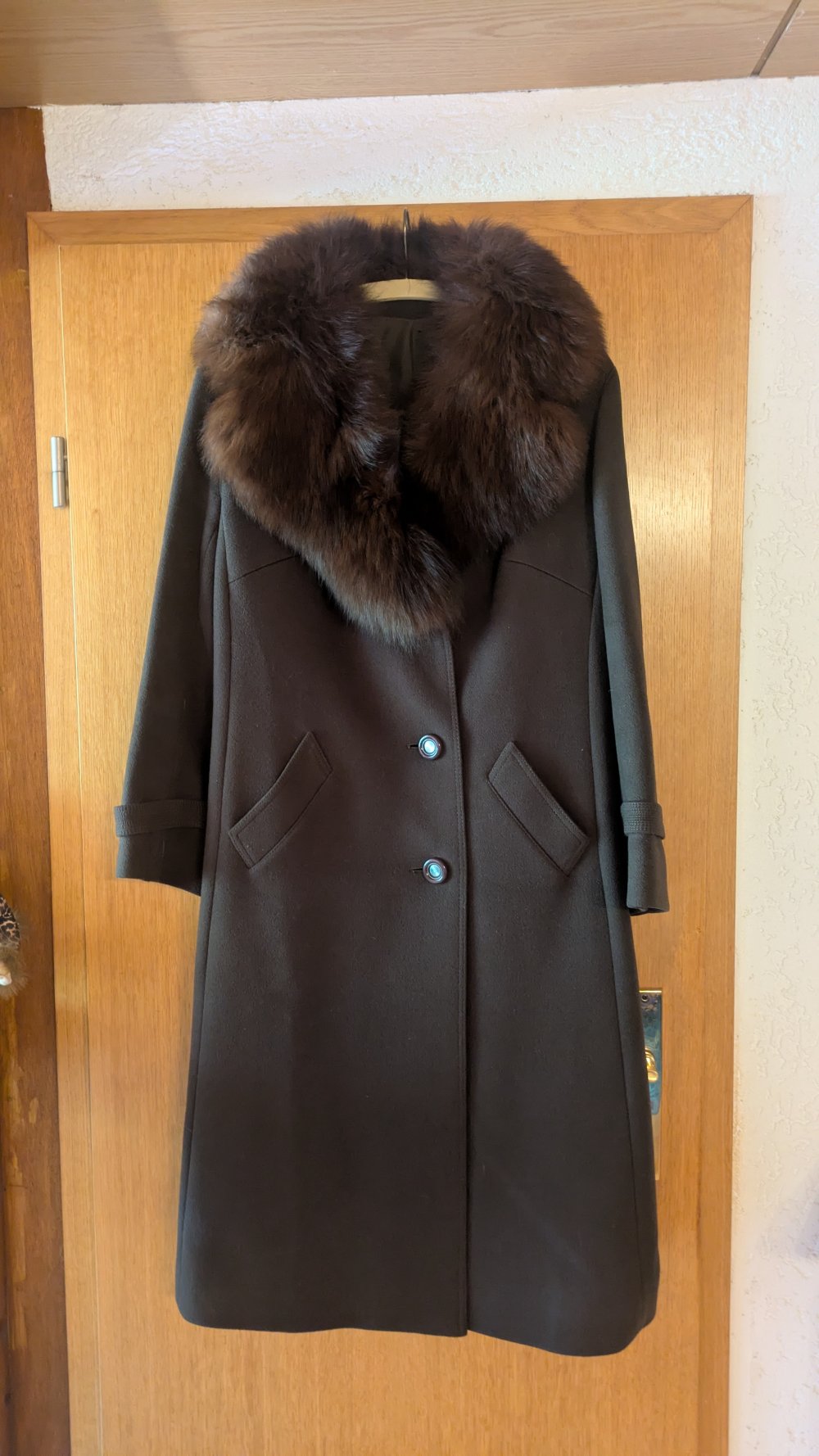 Wollmantel ( Shurwolle) von Jobis Modell, dunkelbraun mit Fellkragen, Gr. 40/42