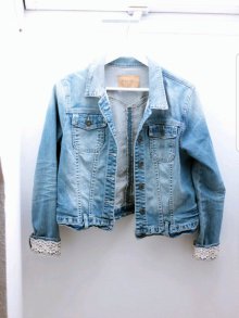 Jeansjacke mit Spitze an den Ärmeln in Gr. 40, hervorragender Zustand.