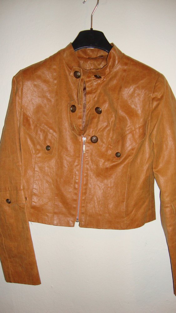 Tolle echte Lederjacke in Kurzform mit speziellen Knöpfen im Marinestil und zwei Eingrifftaschen. Die Jacke ist mit einer Grösse 44 deklariert, aber sie fällt ziemlich klein aus und ich würde mal sagen, dass sie höchstens eine 40/42 ergibt, eine 44 wohl eher wenn man sie offen trägt oder einen kleineren Busen hat...:-)