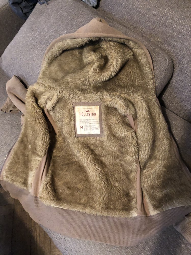 Sehr schöne Jacke von Hollister. Reißverschluss ist kaputt aber ich habe die Jacke immer offen getragen. Sehr warm und kuschelig. Hat über 100€ neu gekostet. Ist zwar eine Größe M aber ist eher eine S meiner Meinung. Taschen. Genaue Maße nach Interesse