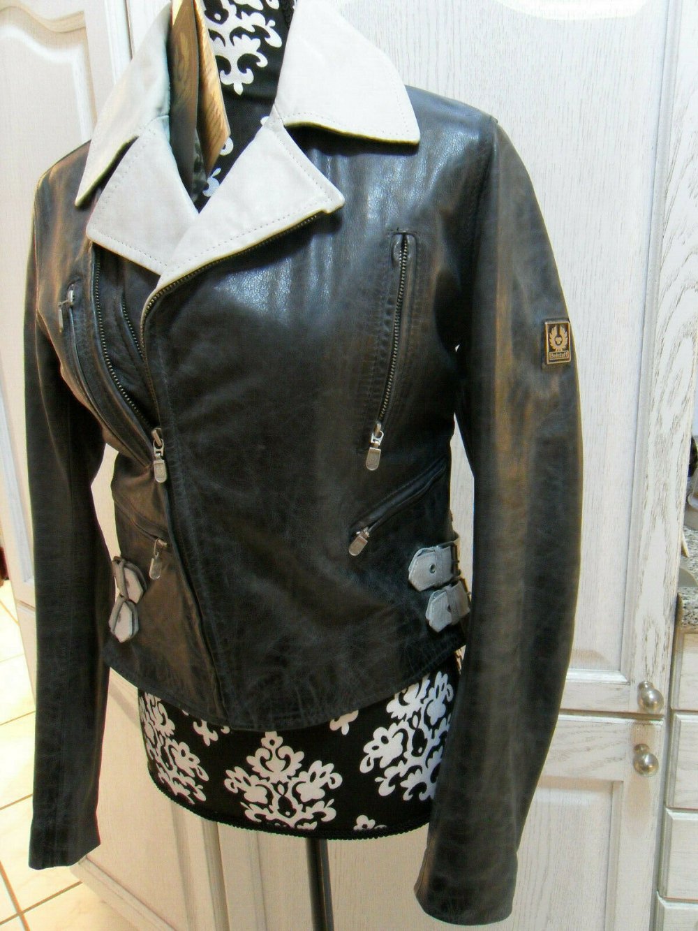 Traumhaft schöne und ausgefallene Belstaff Designer Lederjacke in deutscher Gr. ca. 36 / 38 (Ital. 42) - Modell: Lighting - Gold Label Kollektion - Farbe: Antik-Black mit hellgrauem Kragen. Top Zustand, nur dreimal getragen. Nur noch sehr selten zu bekommen.