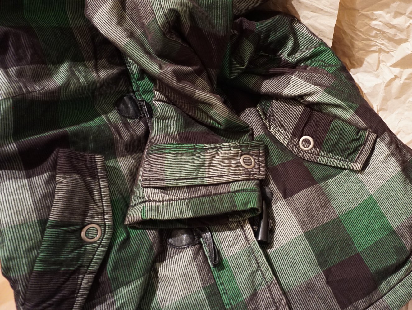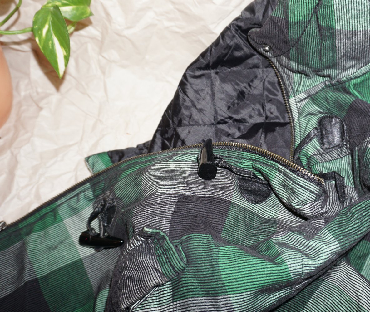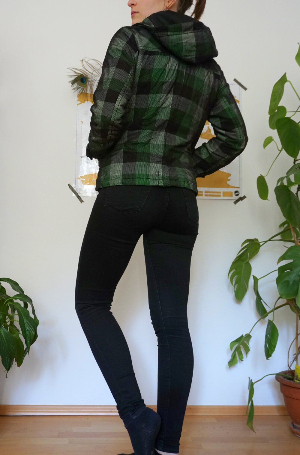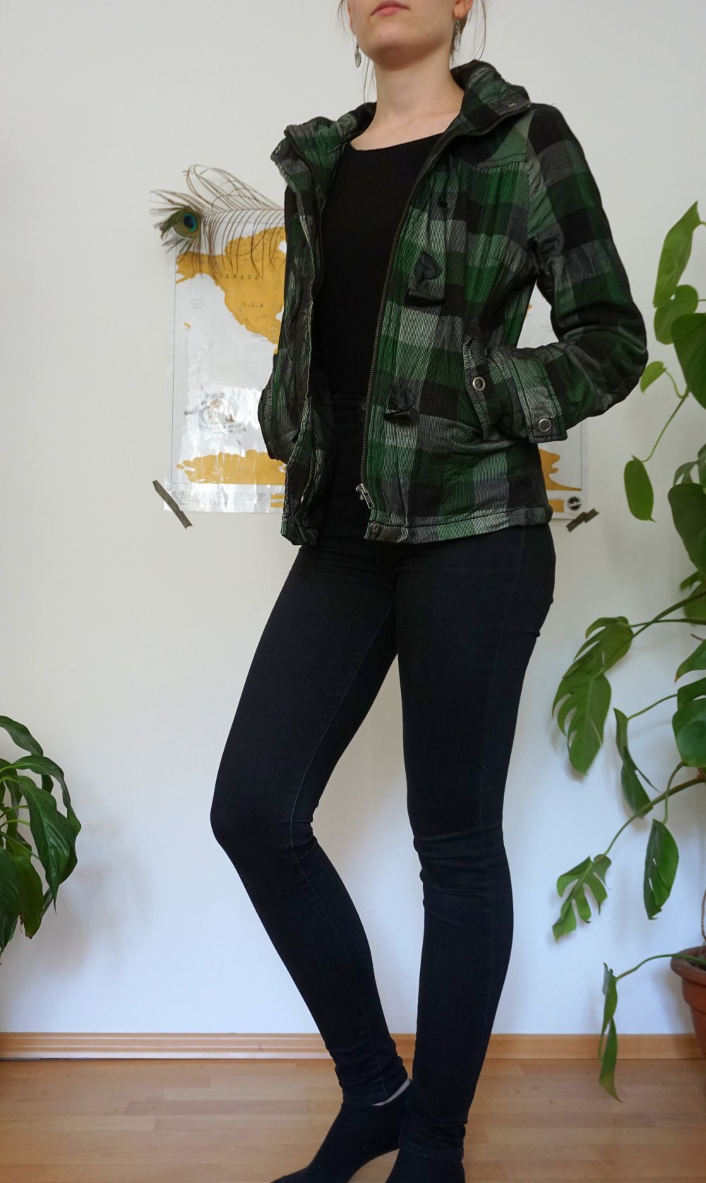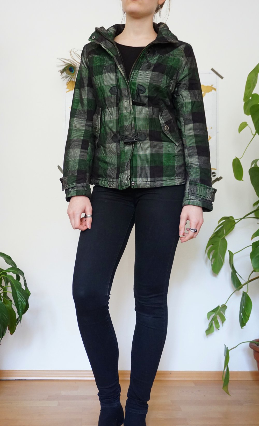 die dunkelgrün-schwarz karierte Jacke hat eonen Reißverschluss & zusätzliche Knöpfe zum Verschließen, sowie eine Kapuze