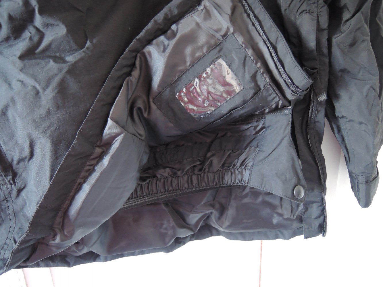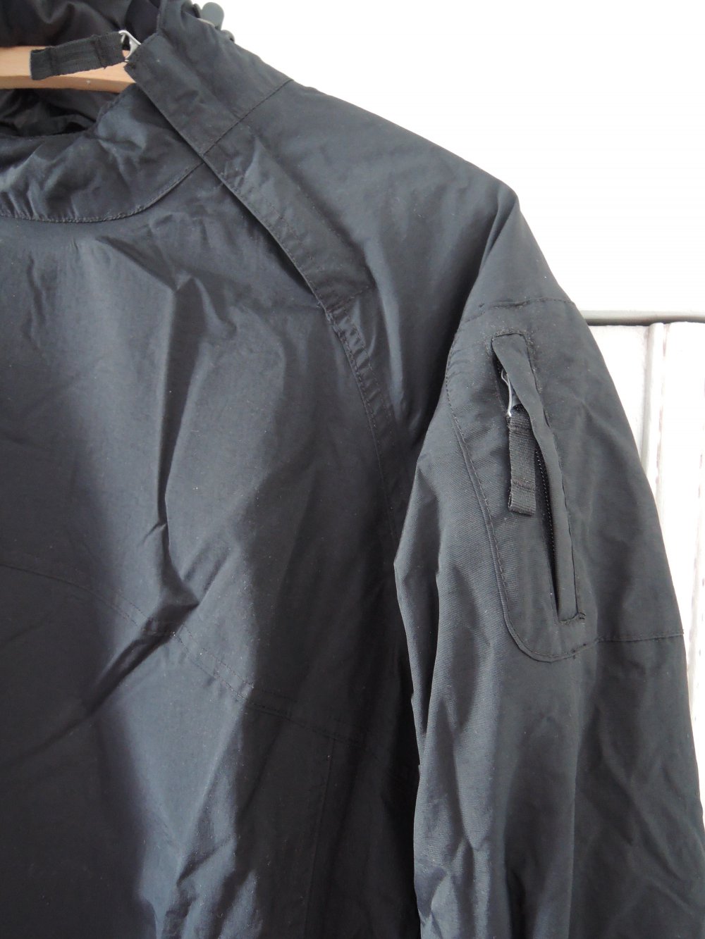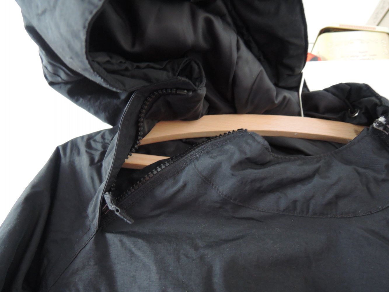 Die Jacke wird über den Kopf gezogen, hat eine Kapuze, am Kragen zwei seitlich eingesetzte Reißverschlüsse und unten an der linken Seite einen weiteren Reißverschluss. Zudem verfügt sich über zwei reguläre Reißverschlusstaschen, eine kleine Reißverschlusstasche auf dem linken Arm sowie ein innen liegendes Bündchen mit Druckknöfen.