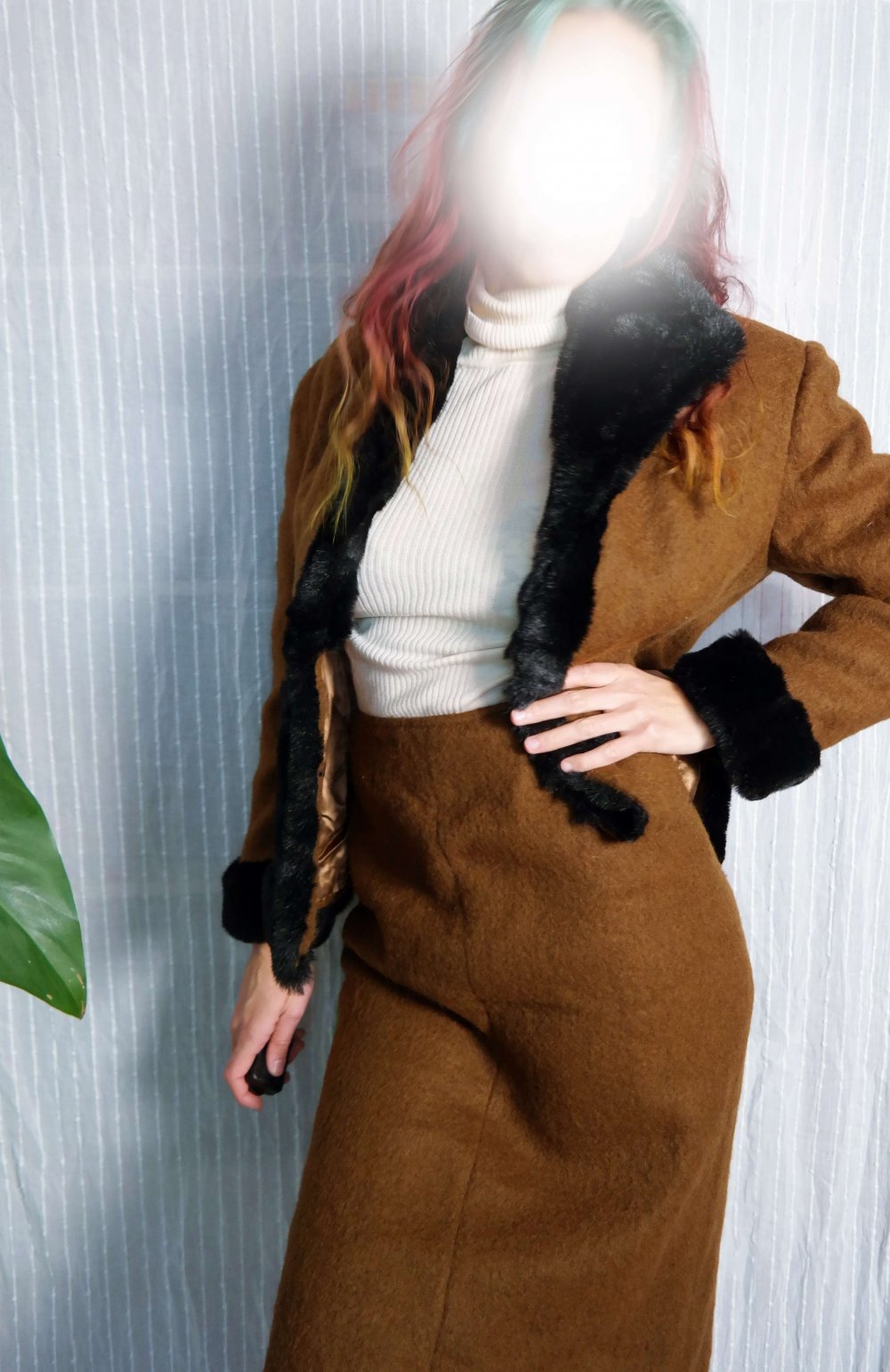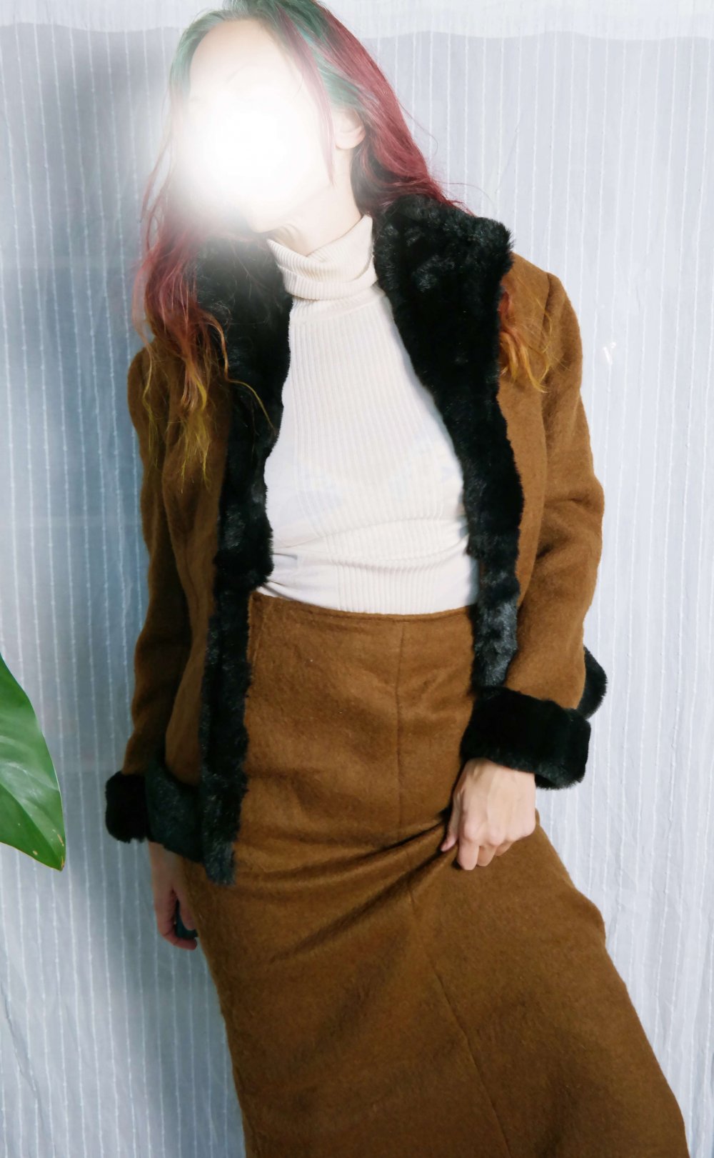 Wunderbares Twinset, wurde selbst genäht (nicht von mir) - daher ein Unikat / Einzelstück. Bei M / 38 siehe Fotos gut passend (mit eventuell noch etwas Luft). Besteht aus einer Jacke / Blazer mit Kragen und Verbrämung aus Kunstpelz / teddyfell + einem High waist Rock. Material scheint Wolle oder ein Wollgemisch zu sein, eventuell Wollwalk? Gut erhalten, nur leichtes Wollpilling. Versand als Paket.