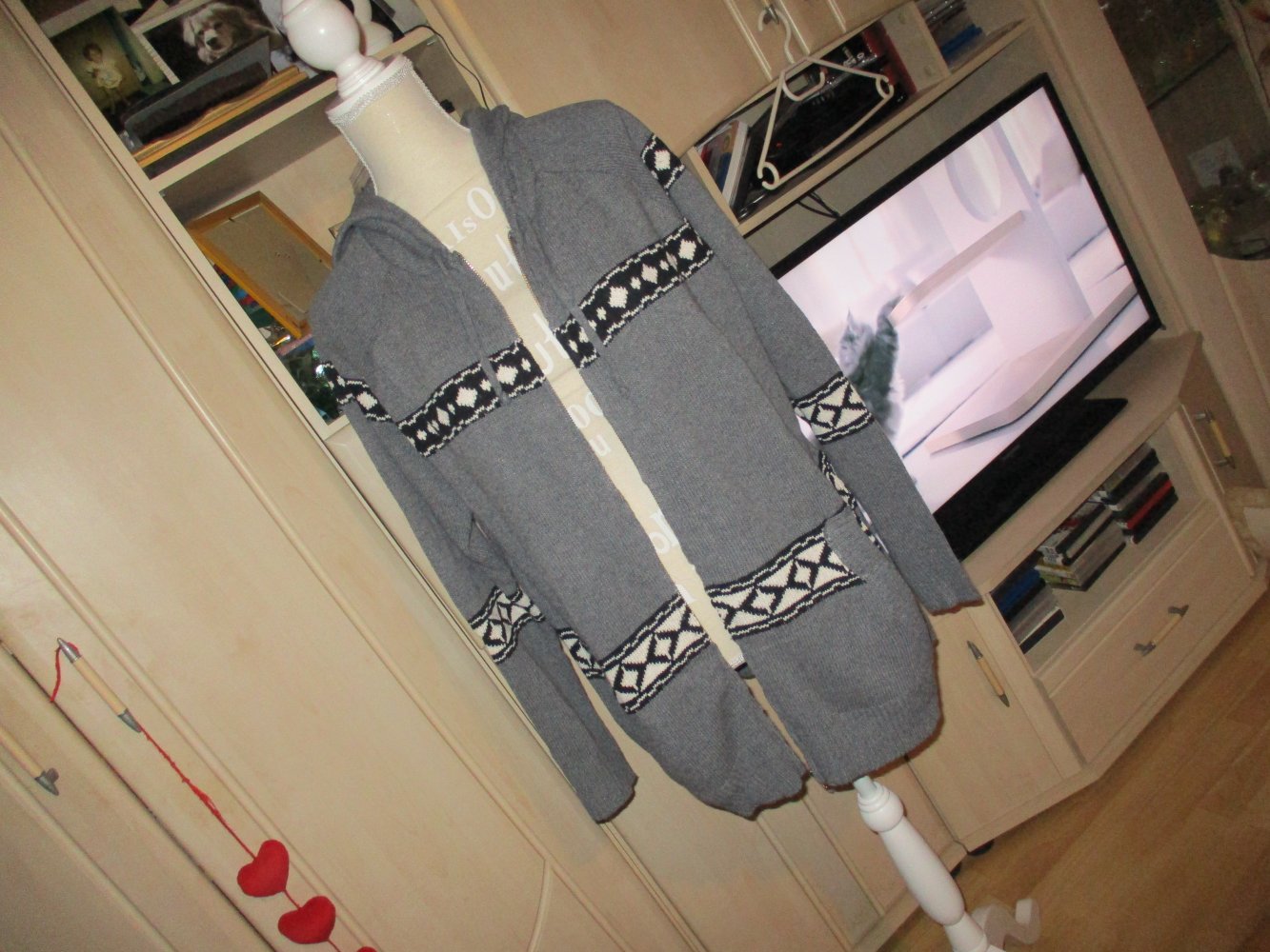 neue sehr schöne graue strickjacke,grösse xl von misslock.mit weiss/schwarzem muster.sehr tolle angenehme qualität,baumwolle/polyester.taschen und tolle kaputze.reissverschluss.