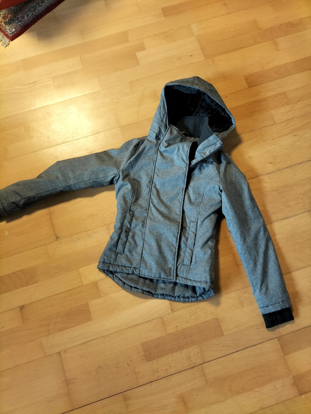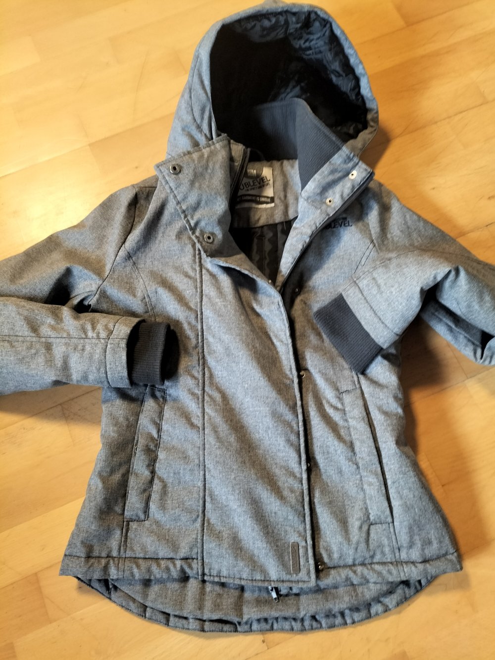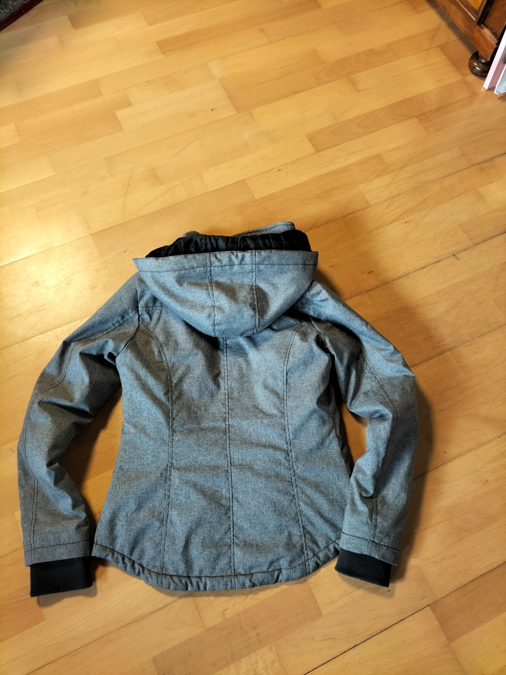 Sportliche taillierte Jacke der Größe M, sie passt aber einer S (165cm,55kg). Es fehlen zwei Gegenstücke der Knöpfe unten an der Knopfleiste und bei einer Tasche. Beim Tragen fällt das aber nicht weiter auf. Sie hat Bündchen an den Handgelenken und am Kragen was super für die Übergangszeit ist. Die Farbe ist GRAU meliert und ist gut kombinierbar. Ich hab so viele Jacken darum Stelle ich sie zum Verkauf.