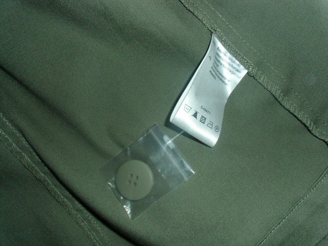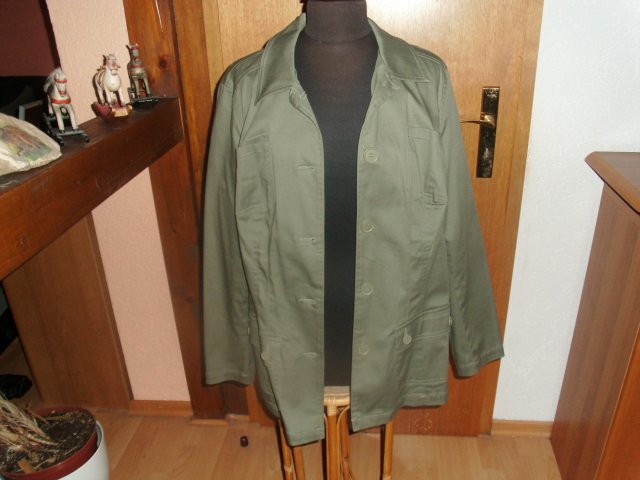 Biete hier eine schöne Jacke von Casual Wear in Größe 46 an. Sie ist mit Gr. 48 angegeben, aber sie fällt kleiner aus und passt mit Gr. 46, gebe unten noch die Maße an. Die Jacke ist schlicht khaki und besteht aus 96% Baumwolle und 4% Elasthan. Sie wird vorn mit Knöpfen geschlossen. Außerdem hat die Jacke zwei größere Taschen mit Knöpfen und zwei kleine Brusttaschen. Die Jacke ist für die wärmere Frühlingszeit und Sommerzeit geeignet. Sie ist ungetragen und hat noch ein Tütchen mit 2 Ersatzknöpfen. Sie hing nur im Schrank in der Hoffnung dass sie doch noch mal passt, aber nun kann sich jemand anderes dran erfreuen.