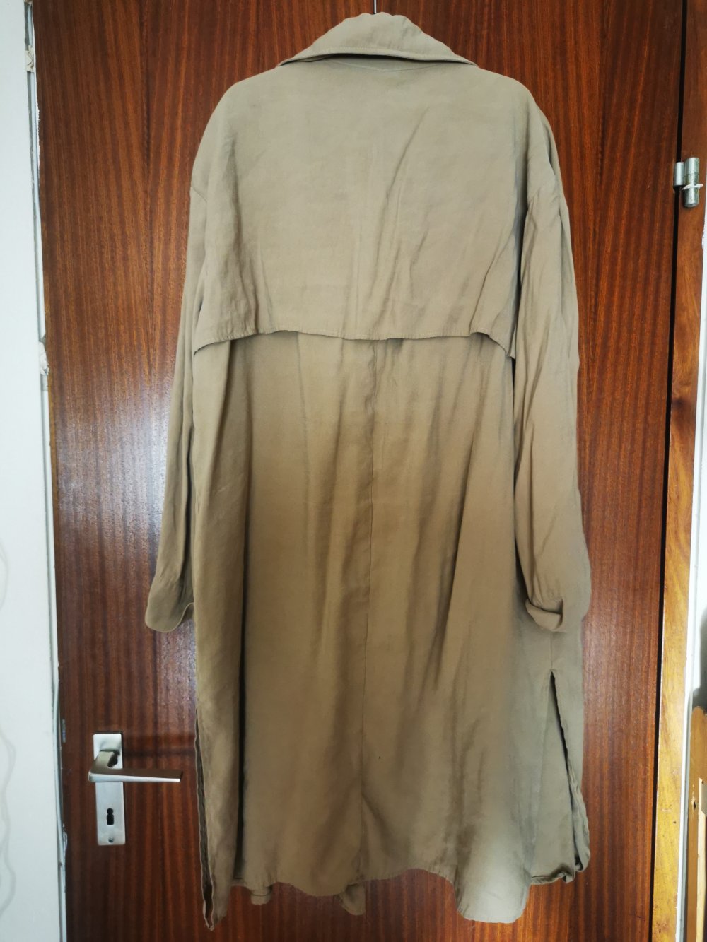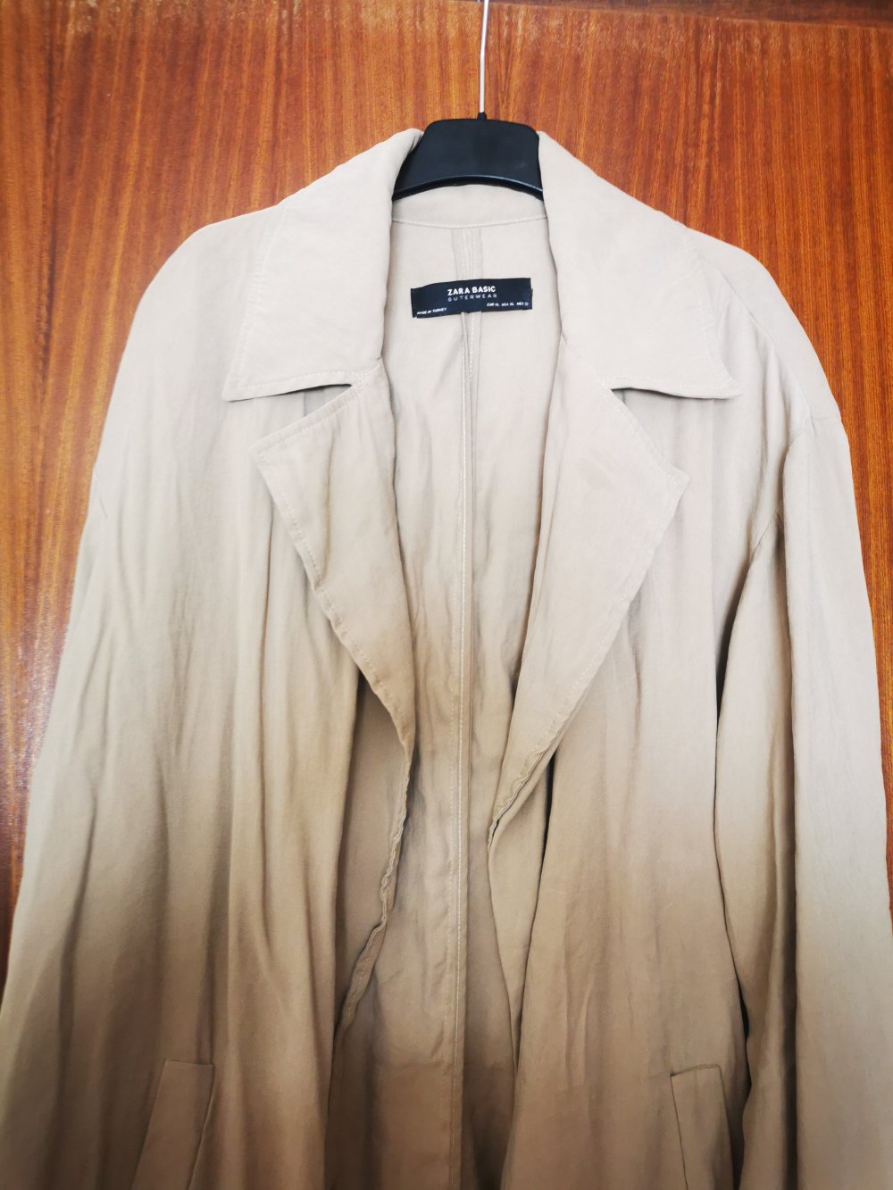 Leichter Trenchcoat in der Farbe beige, der leichte Spuren aufweist.