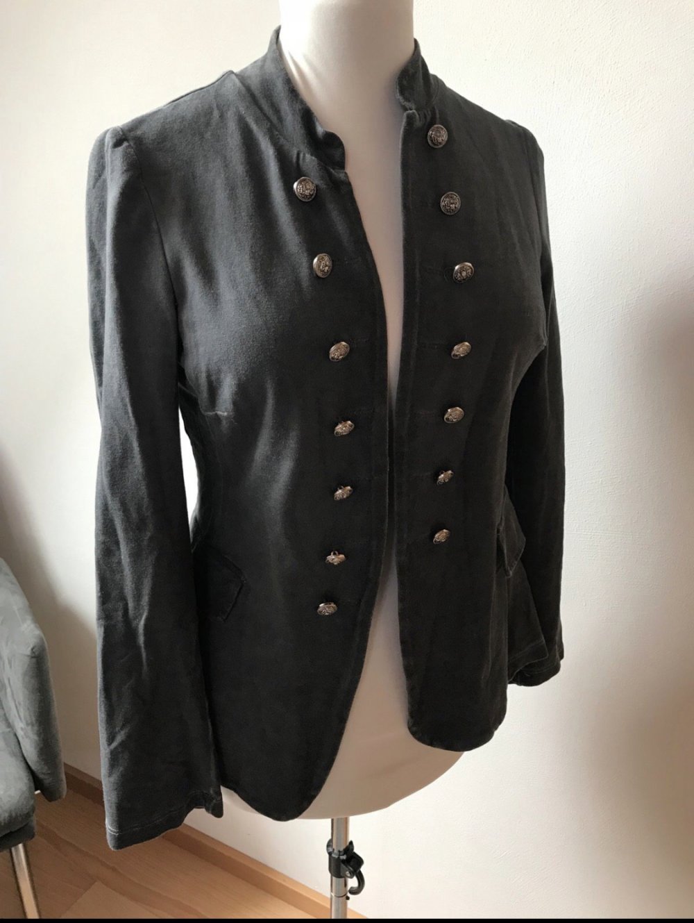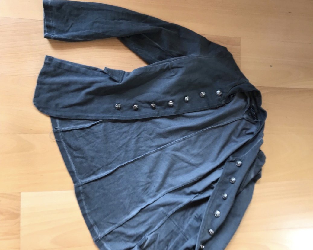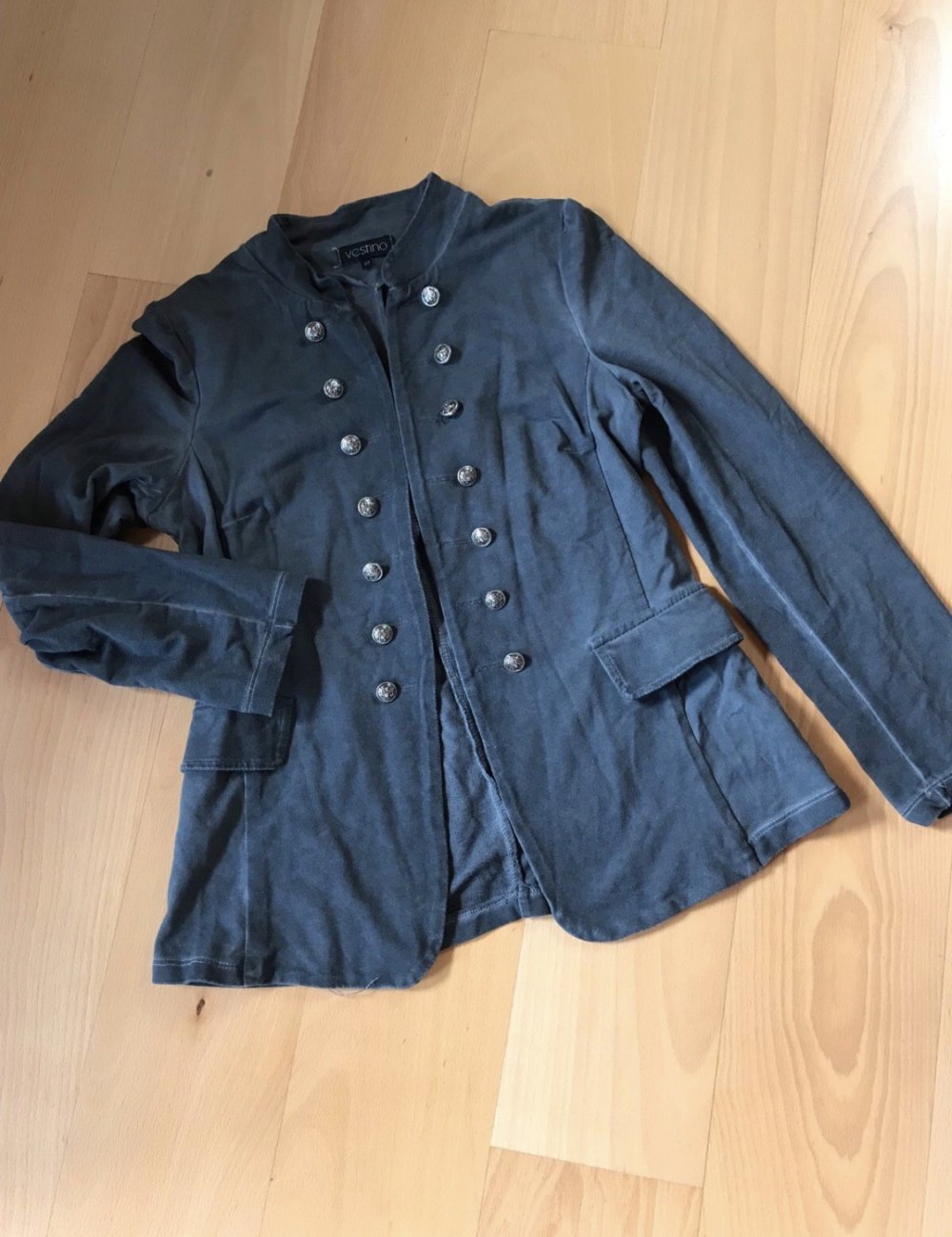#blazer #jacke #jersey #elastan #maritim #military_style #open #sakko #grau #usedwashed #trendy #femme #large #40 #tailliert #uniformlook #grey #zierknopfleiste